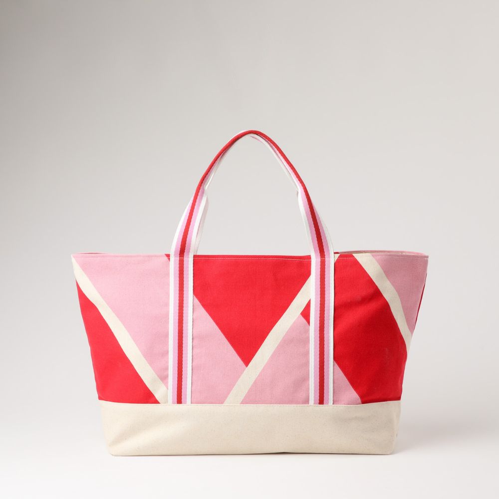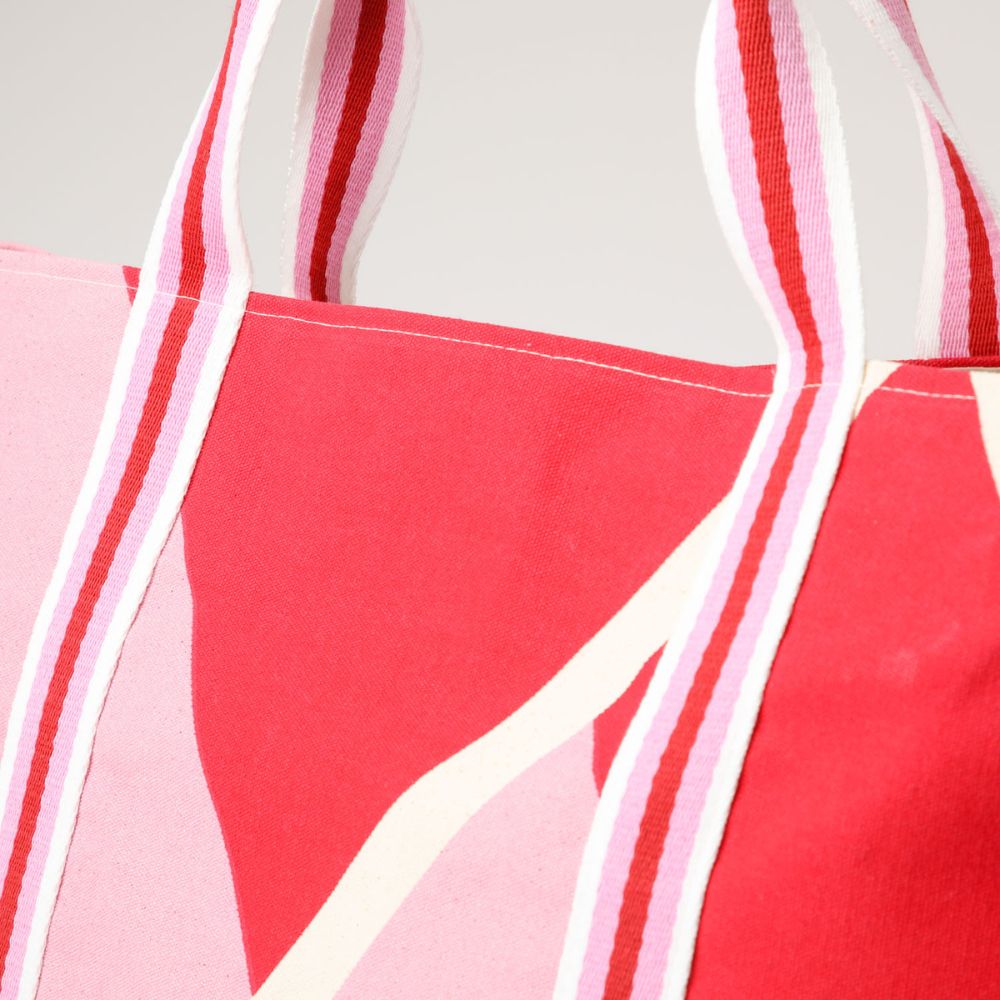 Cartera de tela con estampado geométrico en rojo y rosado sobre beige. Tiene dos asas con líneas rojas, rosadas y blancas, que llegan hasta la base para llevarla como cartera de hombro. Lleva cierre y en su interior tiene un bolsillo abierto.