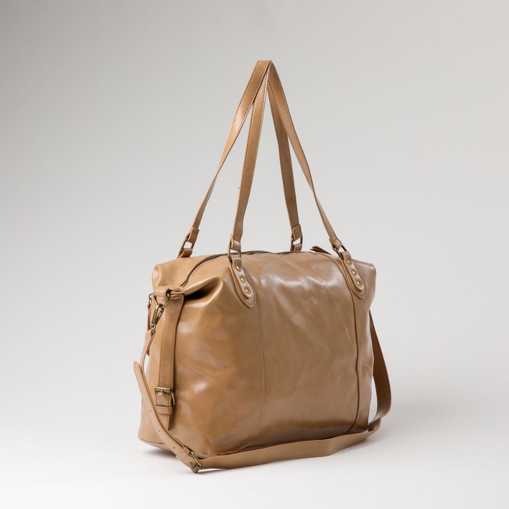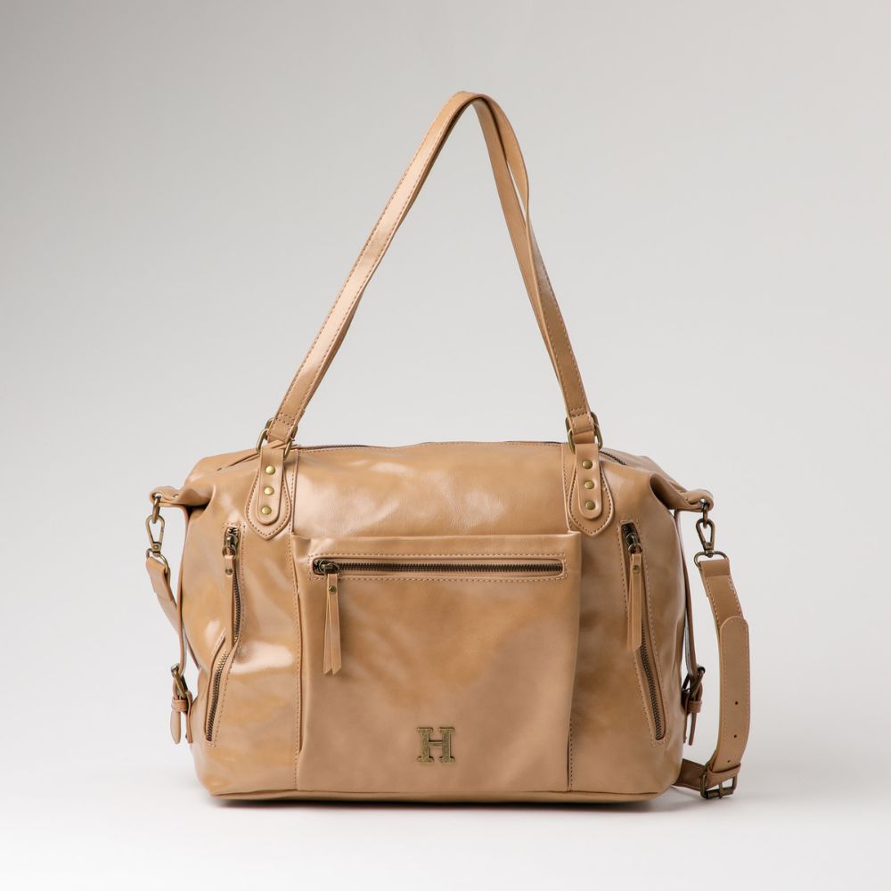 Cartera café camel de ecocuero con dos asas para utilizarla como cartera de hombro y una correa ajustable/desmontable para uzarla como cartera de hombro o cruzada. Por el frente tiene 3 bolsillos con cierre, 2 verticales en los lados y en el medio 1 horizontal. Por los 2 costados lleva correas cortas ajustables. Tiene un bolsillo principal con cierre y en su interior tiene un bolsillo más pequeño con cierre y otros dos bolsillos abiertos. Los cierres, hebillas, ganchos y logo exterior son de metal dorado oscuro.