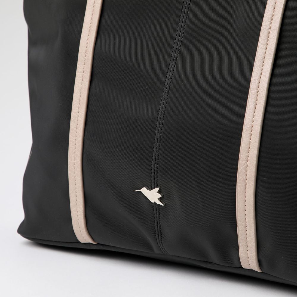Es una cartera de nylon negro con dos asas para utilizarla como cartera de hombro. Por el frente se puede ver que las asas llegan hasta la base y hay una costura vertical negra que divide la cartera en la mitad. En su interior tiene un bolsillo más pequeño con cierre y otros dos bolsillos abiertos. El cierre, hebilla y logo exterior son de metal plateado oscuro, y las asas y el tirador de su cierre principal, son de ecocuero beige.