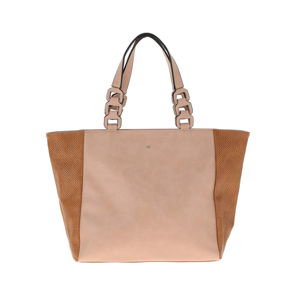 Cartera ID Saly hombro rosada. Es de ecocuero con detalles en ecocuero texturado de color café. Tiene detalles trenzado en sus asas y sistema de cierre para el bolsillo principal.