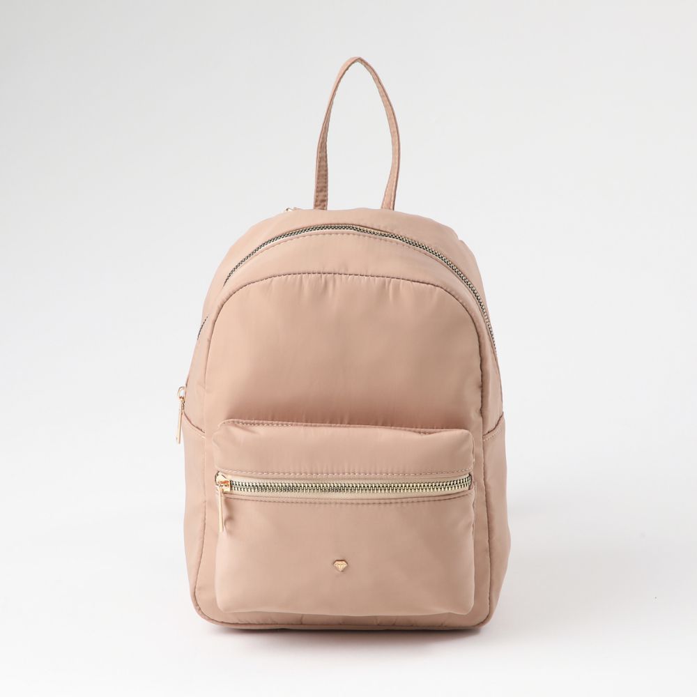Mochila de nylon beige con cierre y un bolsillo exterior. Tiene una asa y dos correas ajustables. Los eslabones, argollas y cierre son de metal dorado.