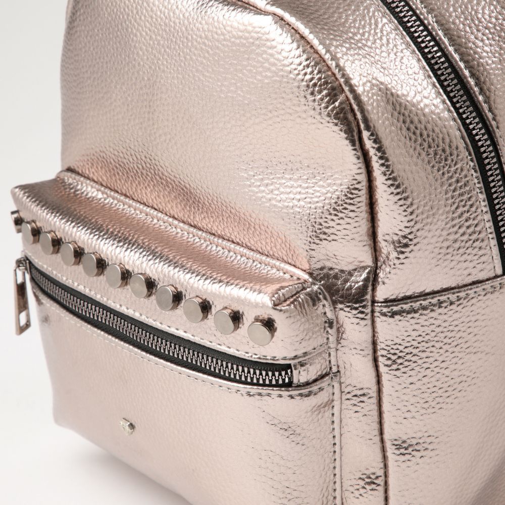 Mochila de ecocuero plateado con cierre y un bolsillo exterior. Tiene una asa y dos correas negras ajustables. Los eslabones, argollas y cierre son de metal plateado oscuro.