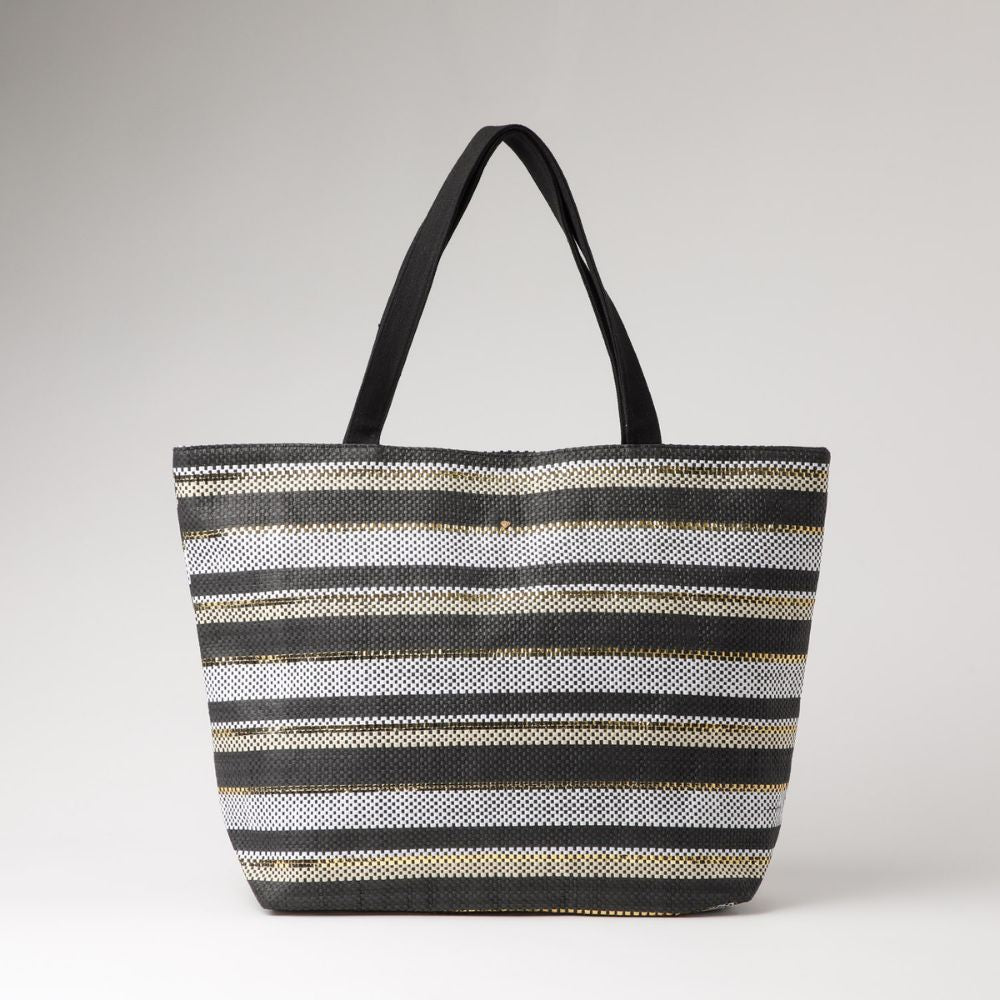 Cartera de papel tipo rafía con dos asas de tela negra para llevarla como cartera de hombro. La rafia tiene un patrón de líneas horizontales negras, blancas, beige y doradas. Lleva cierre y en su interior hay un bolsillo con cierre.