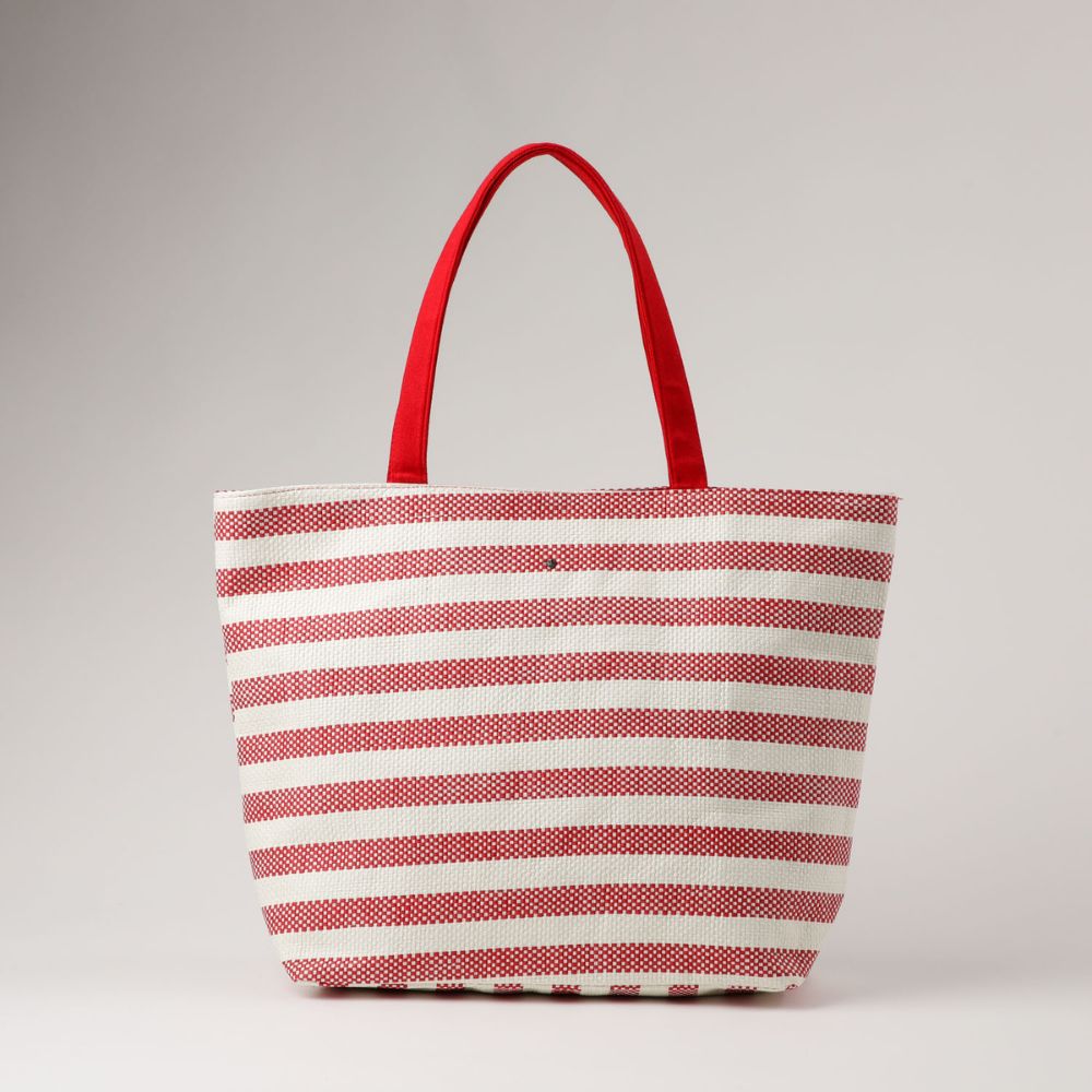Cartera de papel tipo rafía con dos asas de tela roja para llevarla como cartera de hombro. La rafia tiene un patrón de líneas horizontales rojas y blancas. Lleva cierre y en su interior hay un bolsillo con cierre.