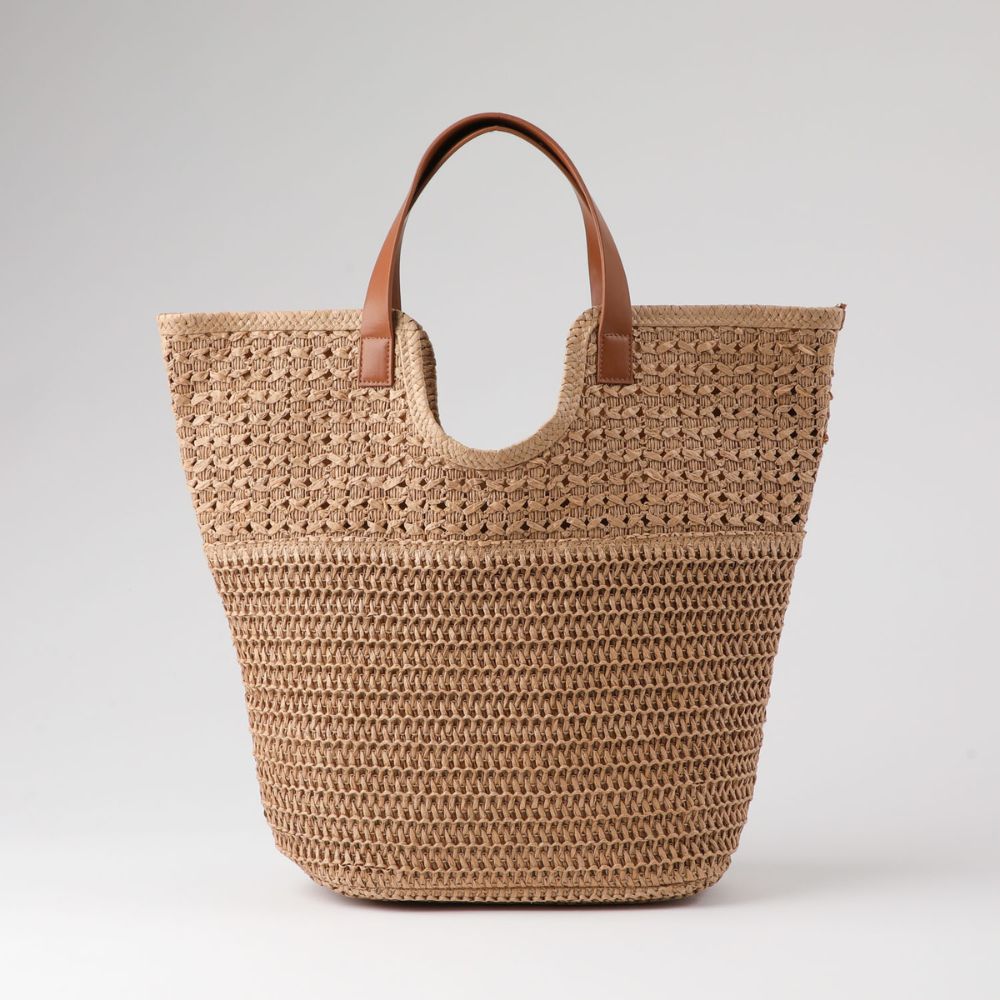 Cartera playa papel tipo rafia color natural con cierre y asas de ecocuero café cortas.
