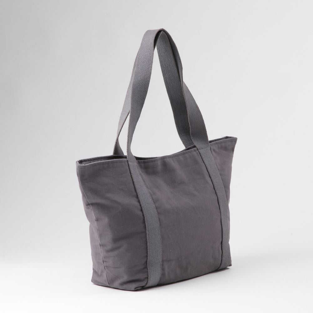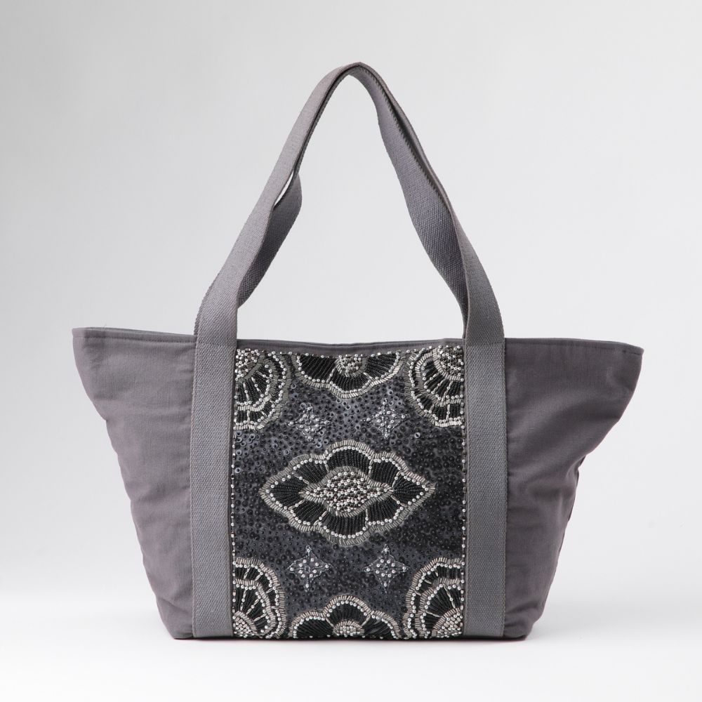 Cartera de canvas gris con patrón de flores en el centro de mostacillas en tonos grises, negro y plateado. Tiene cierre y dos asas para llevarla como cartera de hombro. En su interior tiene dos bolsillos abiertos. El tirador es de metal dorado oscuro.
