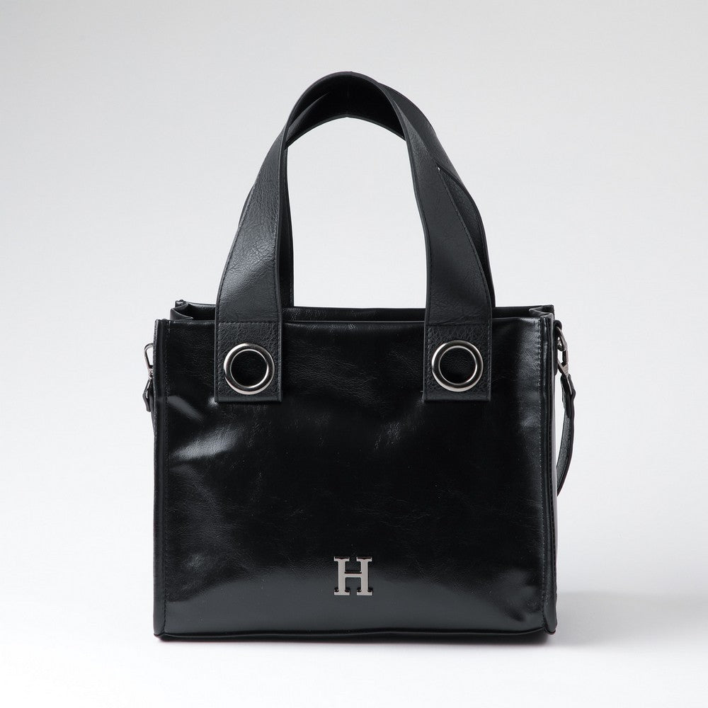 Cartera cruzada en ecocuero negro de acabado liso, con asas firmes y argollas metálicas decorativas en la parte superior. Incluye cierre superior, bolsillo interior con cierre y correa larga desmontable para usar al hombro o cruzado, además de logo H en metal plateado al frente. De uso práctico para el día a día, trabajo o salidas urbanas. Un diseño moderno y funcional.
