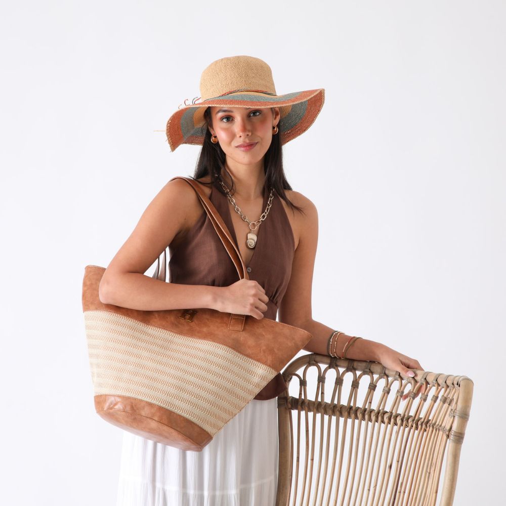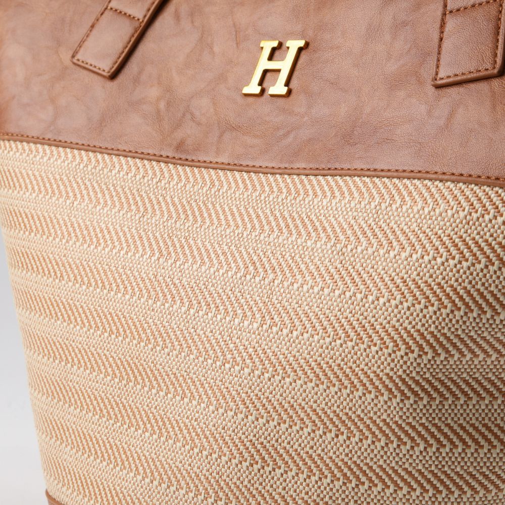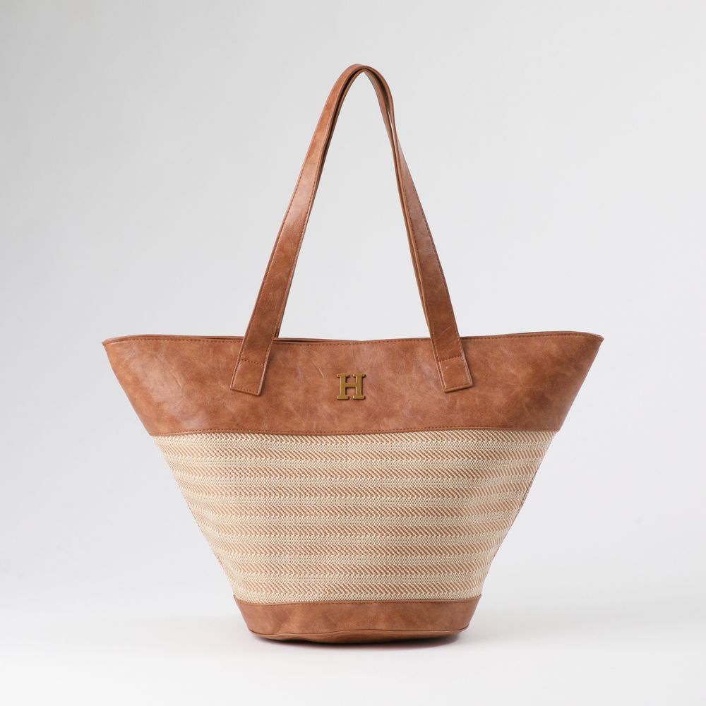 Cartera de ecocuero camel de hombro con dos asas, cierre y un diseño en zigzag camel con beige. Al interior tiene un bolsillo con cierre y dos abiertos. El tirador, logo y cierre son de metal dorado oscuro.