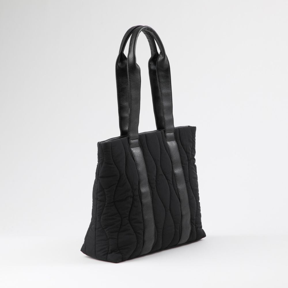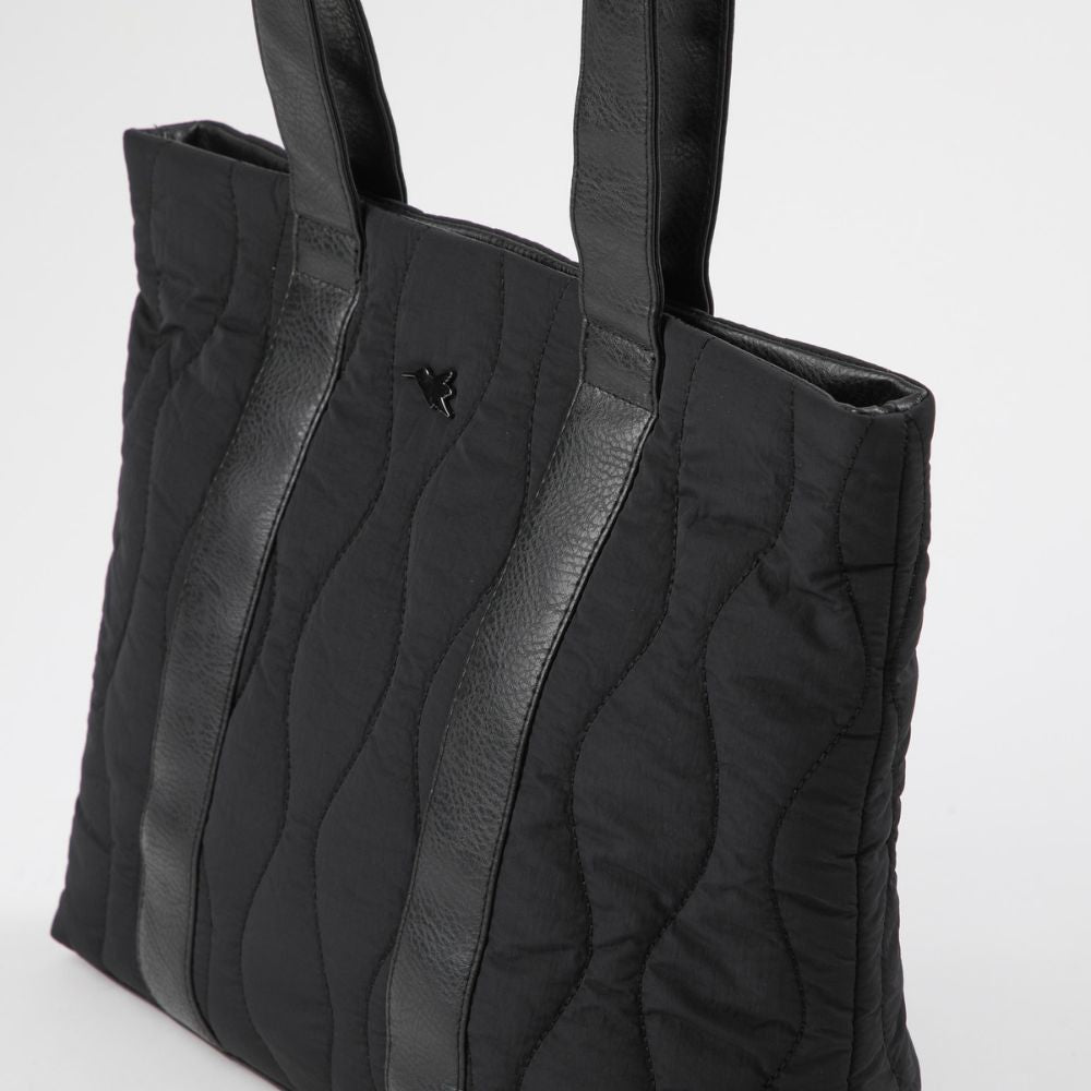 Cartera shopper con cierre de nylon quilted y detalles en ecocuero negro. Tiene 3 bolsillos internos.