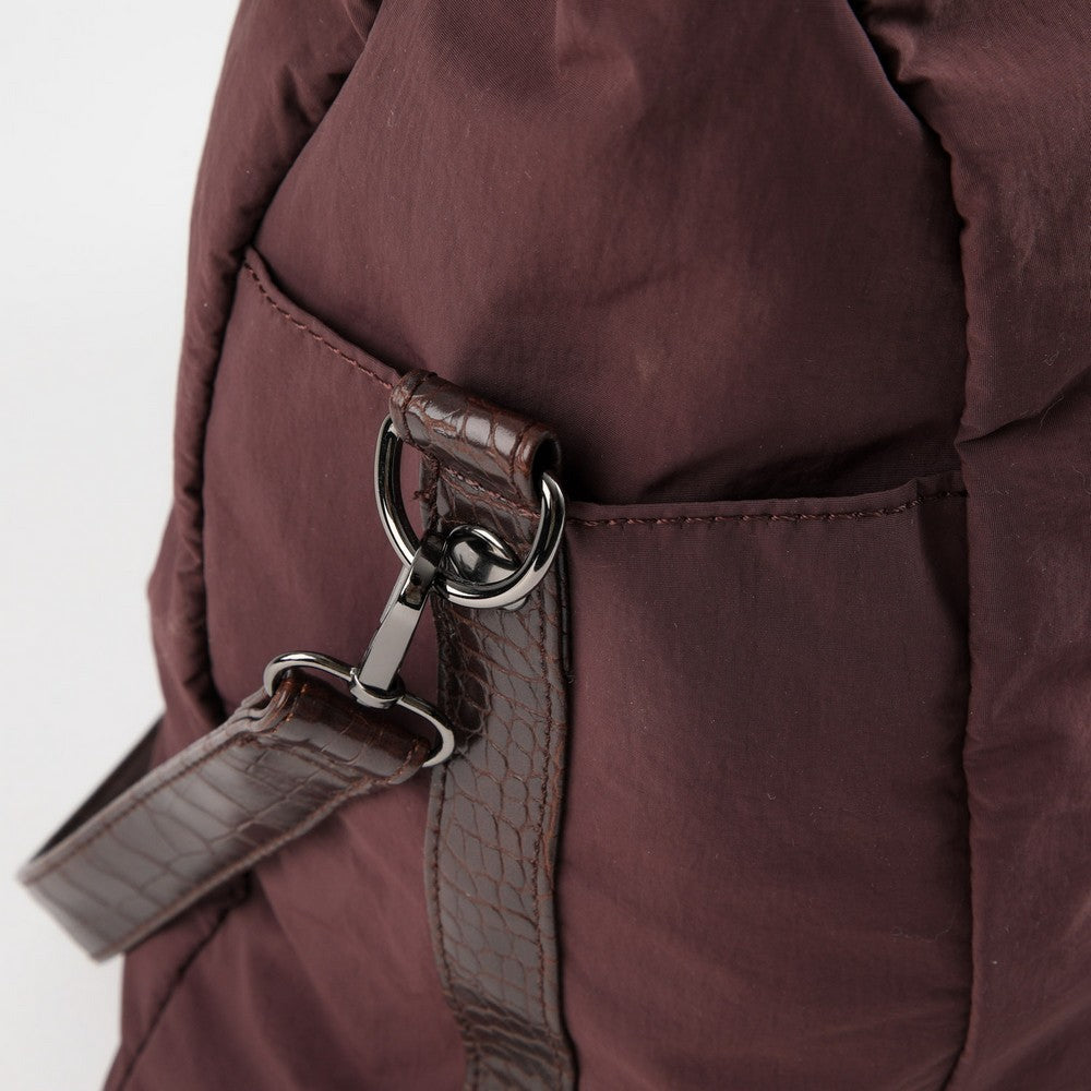 Bolso en nylon color café, con detalles en ecocuero texturizado tipo croco en asas y base. Incluye cierre superior, bolsillo interior con cierre y compartimentos abiertos para organización, con logo H aplicado en el frente. Incluye una correa ajustable y desmontable. De uso práctico diario, ideal para trabajo o jornadas largas. Un diseño moderno y funcional.