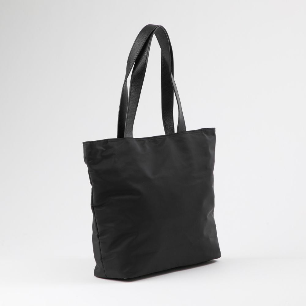 Cartera shopper con cierre de nylon con detalles en ecocuero negro. Tiene 3 bolsillos internos.