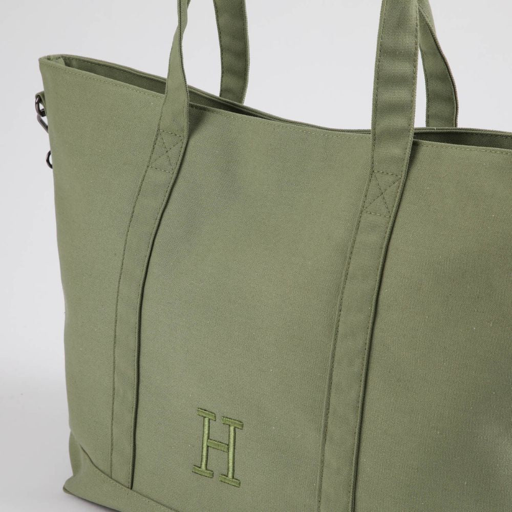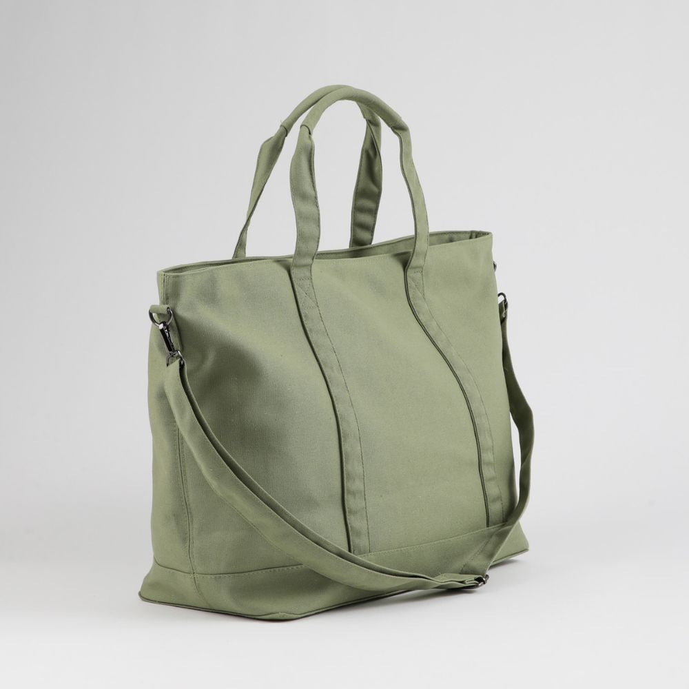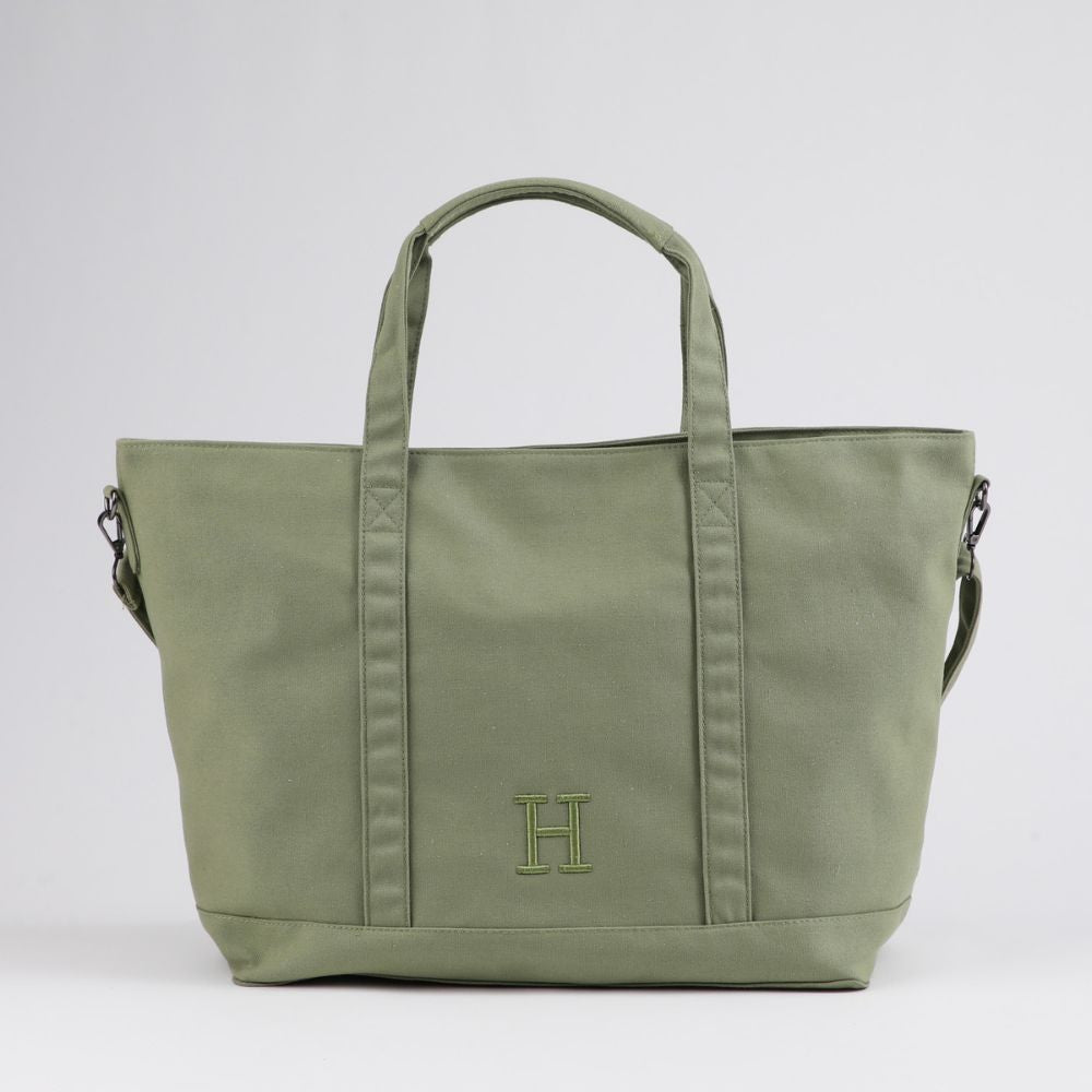 Cartera de canvas verde con dos asas para llevarla como cartera de hombro y una correa ajustable. Lleva cierre y en su interior hay un bolsillo con cierre y dos abiertos.