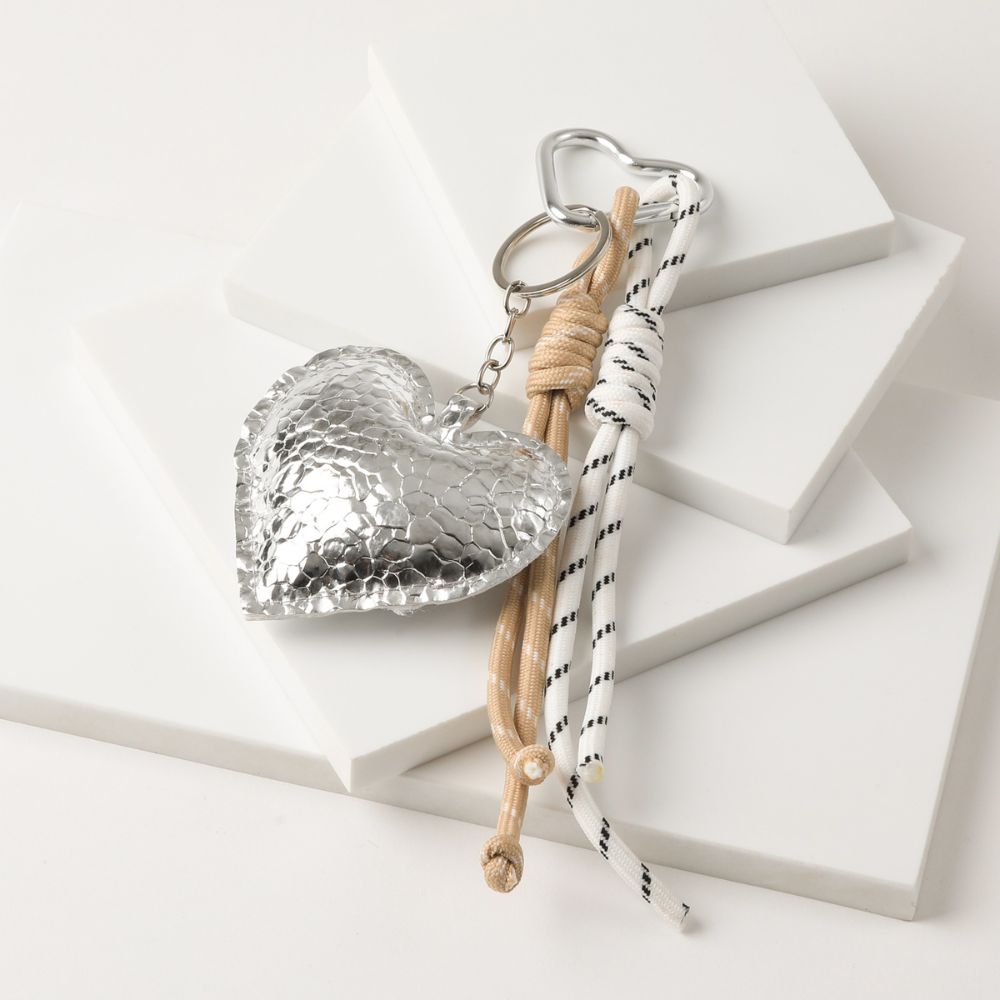 Llavero en metal plateado con charm de corazón grande en ecocuero plateado y dos cuerdas con nudo en tonos beige y blanco.