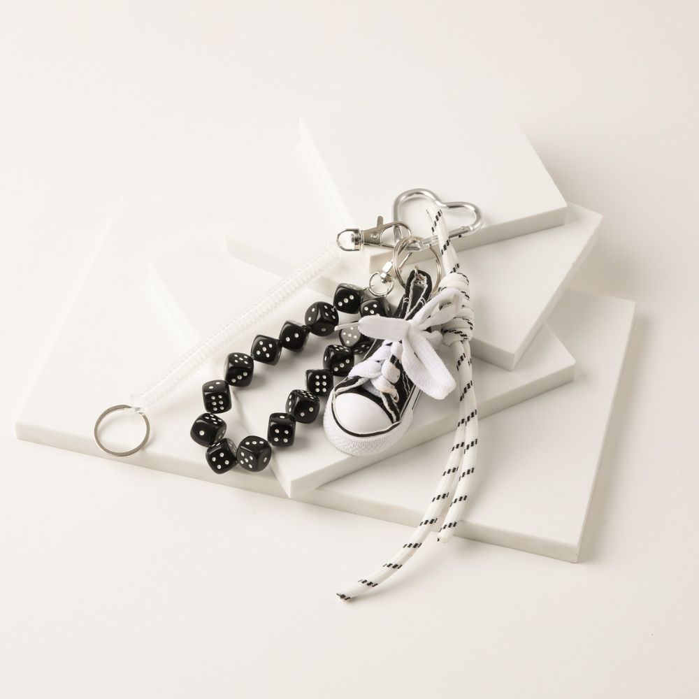 Llavero plateado con charms de zapatilla negra, una cadena de dados negros, una cuerda con nudo y otra enroscada, blancas.