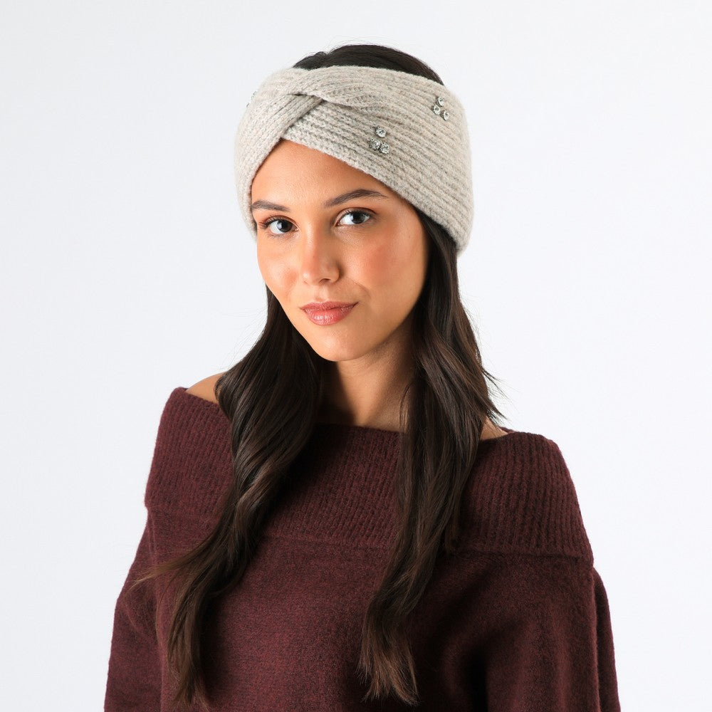 Cintillo tejido en lana de color beige, con diseño cruzado al frente y terminaciones acanaladas. Incluye aplicación de pequeños cristales plateados como detalle decorativo y calce cómodo para usar sobre la cabeza cubriendo las orejas. Sin logo visible. De uso práctico para abrigar y complementar looks de invierno. Un diseño moderno y funcional.