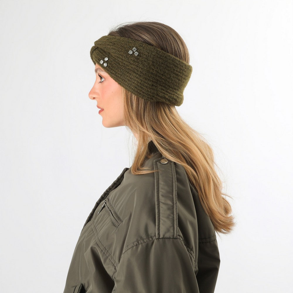 Cintillo tejido en lana de color verde oliva, con diseño cruzado al frente y terminaciones acanaladas. Incluye aplicación de pequeños cristales plateados como detalle decorativo y calce cómodo para usar sobre la cabeza cubriendo las orejas. Sin logo visible. De uso práctico para abrigar y complementar looks de invierno. Un diseño moderno y funcional.