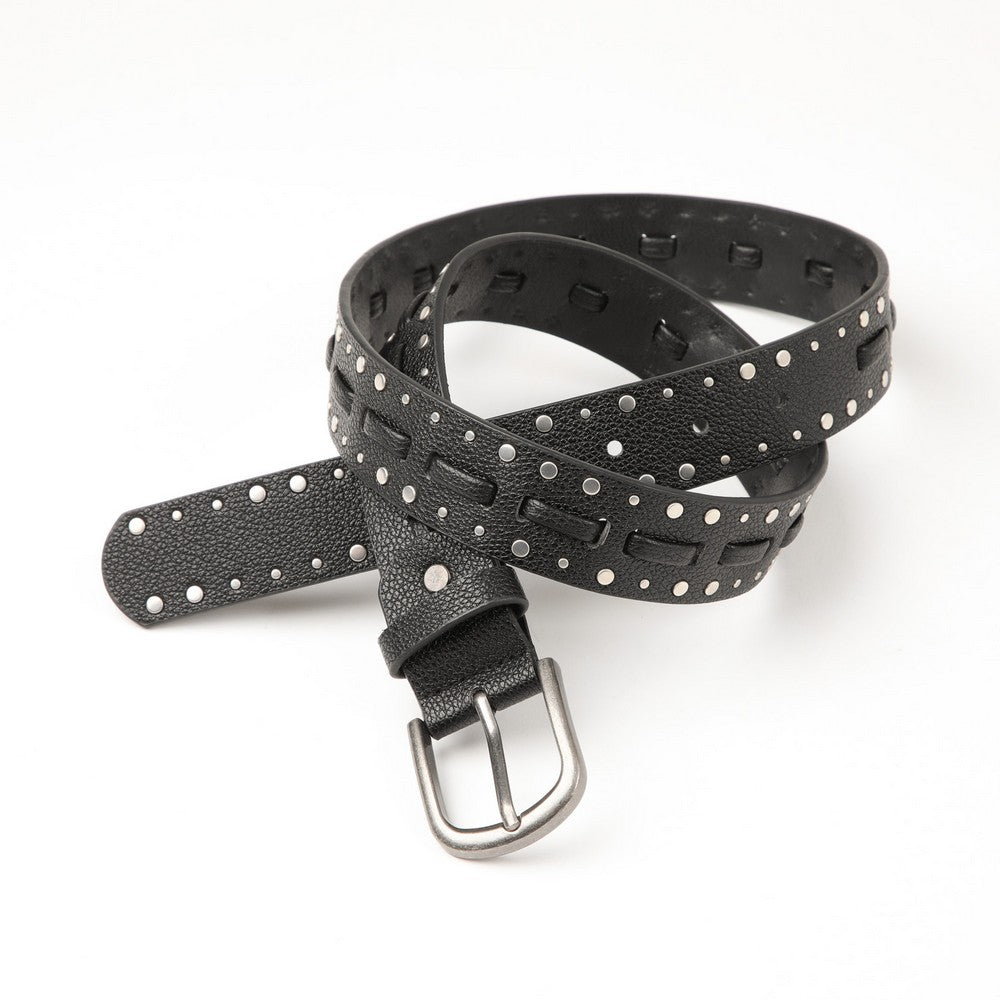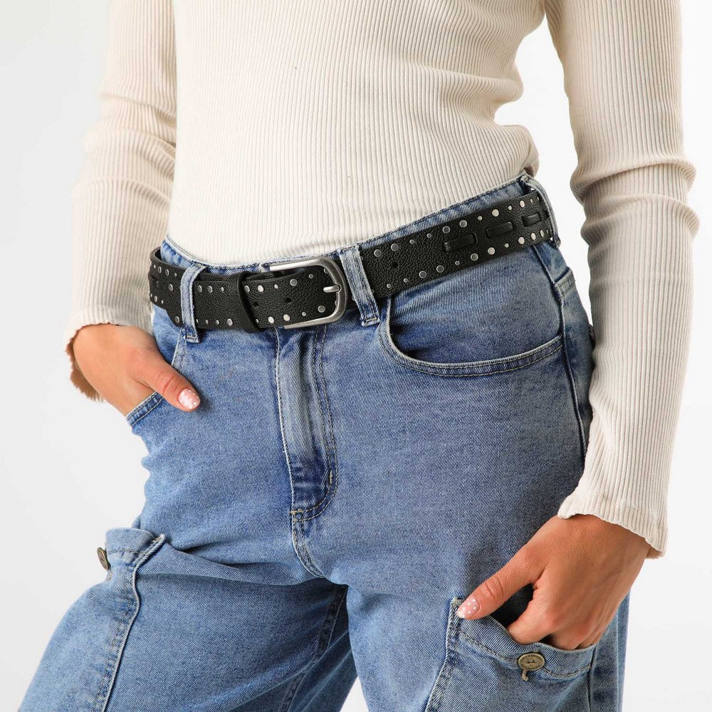 Cinturón de color negro, con diseño de tachas metálicas distribuidas a lo largo de la pieza. Presenta hebilla metálica, ideal para complementar looks urbanos y casuales. Un accesorio fácil de combinar.