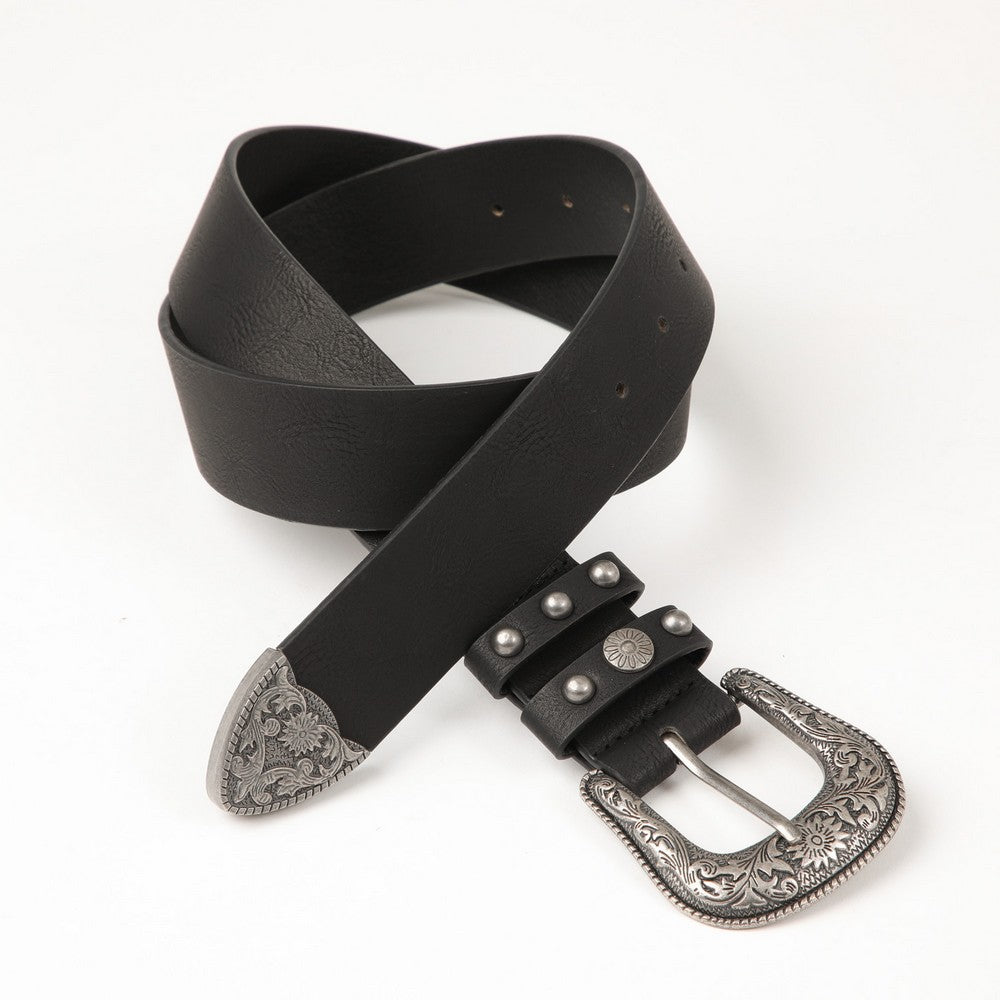 Cinturón ancho de eco cuero, con terminación lisa y estructura firme. Hebilla metálica de estilo western con grabado decorativo y pasador con remaches metálicos. Incluye punta metálica a juego, también con relieve, que refuerza el diseño y el uso.Un accesorio de diseño moderno y funcional, pensado para ajustar en distintos largos y aportar carácter a looks urbanos o más relajados. Un cinturón práctico y fácil de combinar.