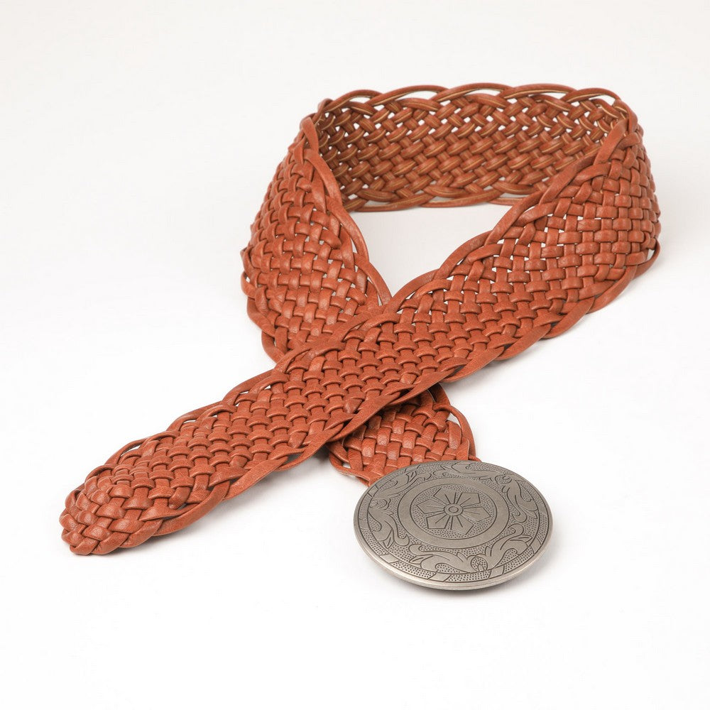 Cinturón de diseño trenzado en color café, con hebilla metálica redonda de gran tamaño y grabado decorativo en relieve. Un accesorio práctico para el día a día.