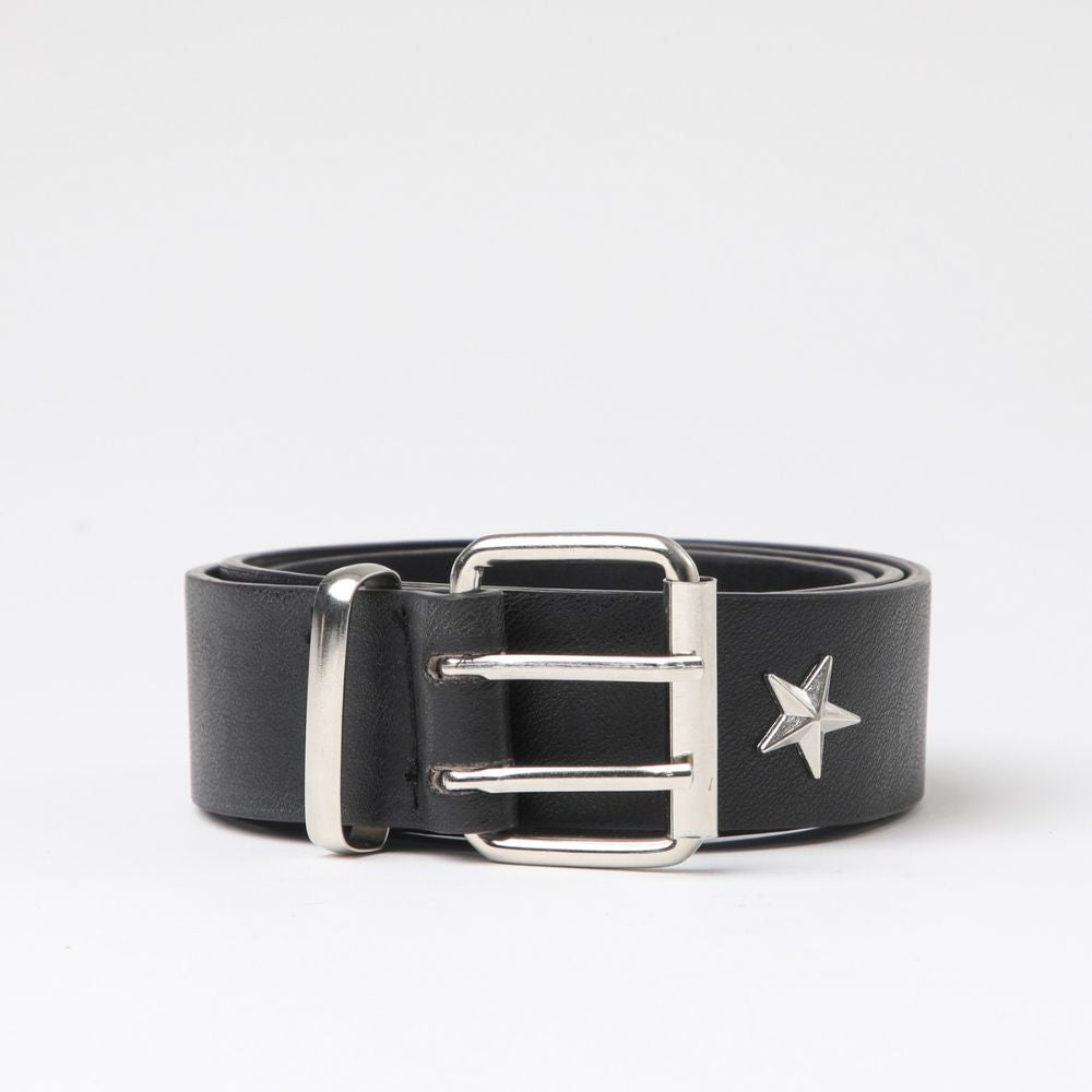 Cinturón de ecocuero negro liso con tachas de estrella metálicas plateadas con hebilla rectangular, pasador metálico y 5 pares de ojetillos.