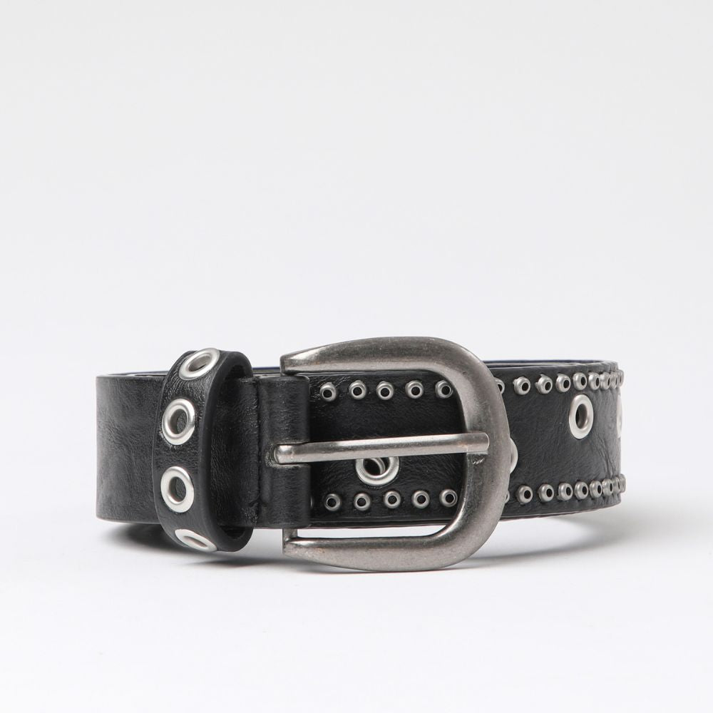 Cinturon negro con ojetillos y hebilla plateada. Este cinutrón negro tiene una textura lisa con ojetillos pequeños a los costados y ojetillos grandes distribuidos en forma de zigzag en el centro, tiene 6 hojales. Tiene una hebilla blateada redonda y un pasador con hojetillos metálicos.