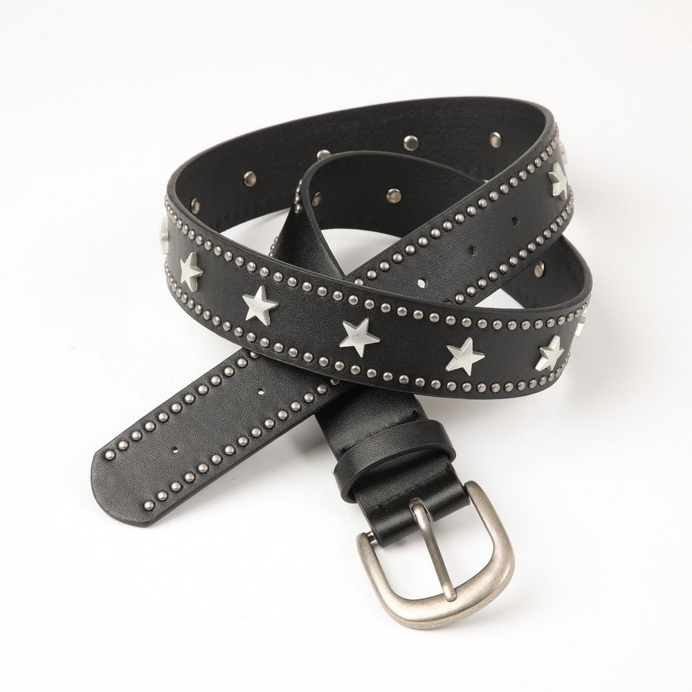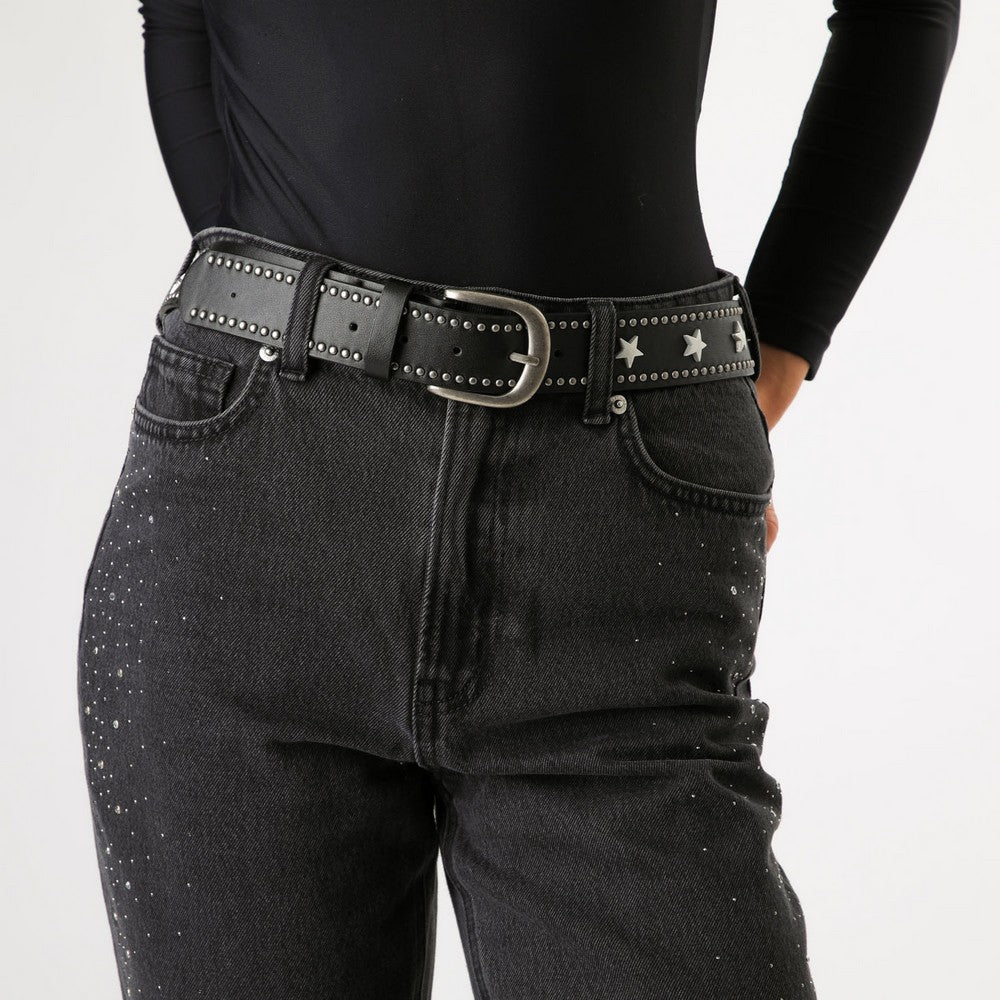 Cinturón color negro con aplicación de tachas y estrellas metálicas, y hebilla en tono plateado envejecido. Un accesorio con carácter, ideal para darle un toque protagonista a looks urbanos o casuales.
