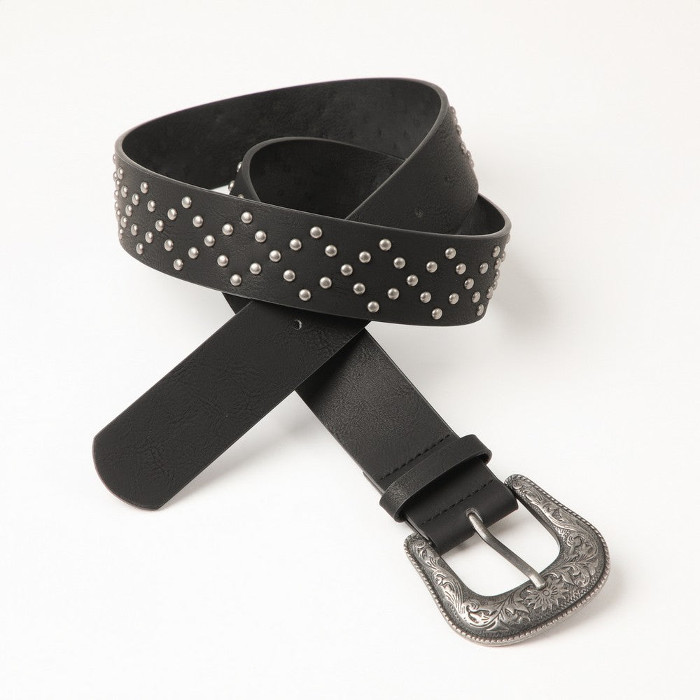 Cinturón de color negro con diseño clásico. Presenta hebilla metálica de estilo decorativo y aplicación de tachas metálicas a lo largo de la correa. Incluye pasador y sistema de ajuste tradicional con perforaciones. Un accesorio práctico para complementar distintos looks.