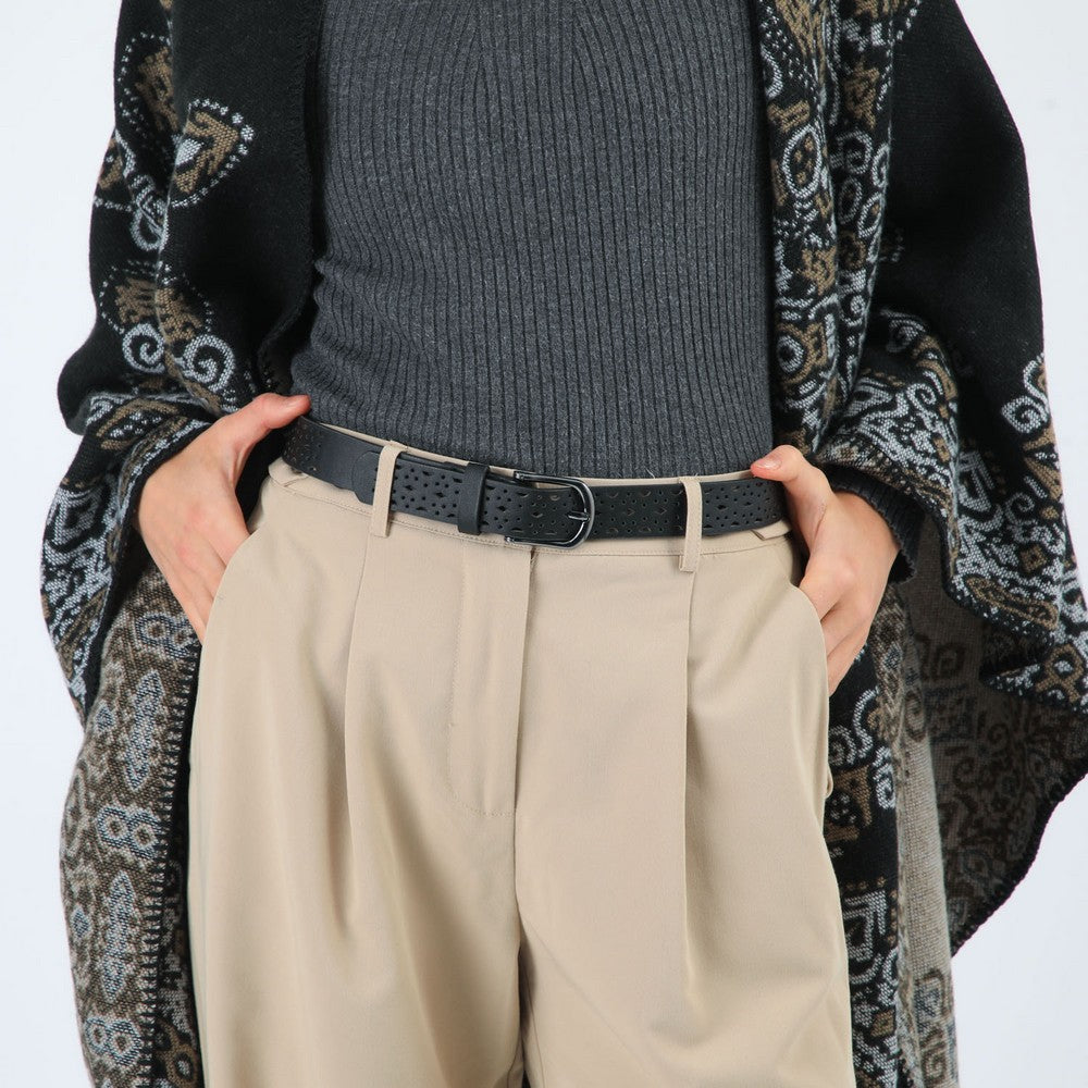 Cinturón en color negro, con diseño calado en la tira y hebilla metálica plateada. Un accesorio simple y fácil de combinar.