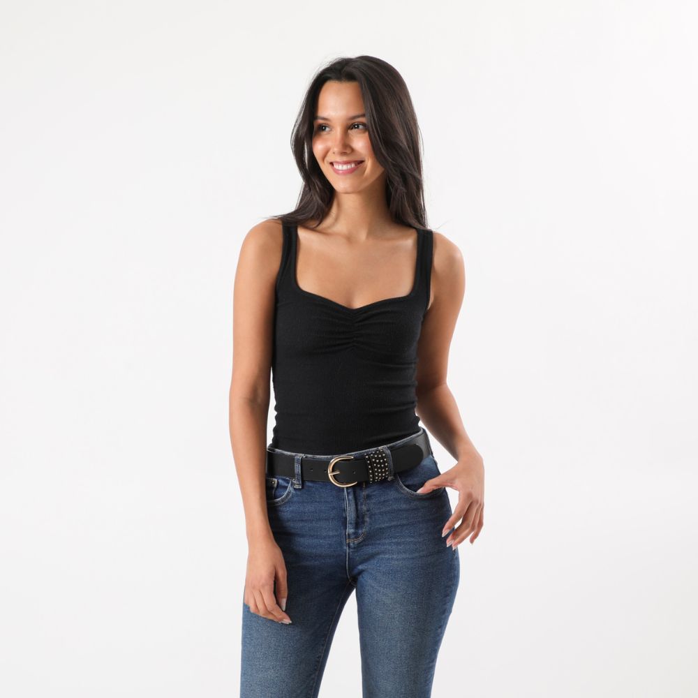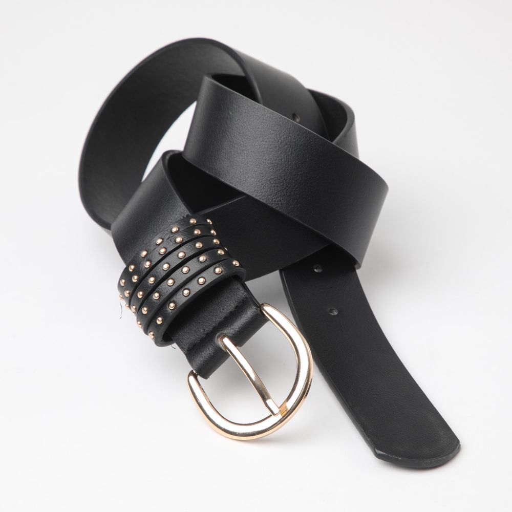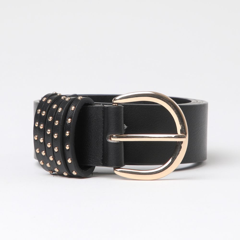 Cinturón ecocuero negro liso con hebilla redondeada dorada y pasador de 5 tiras con tachas redondas doradas.