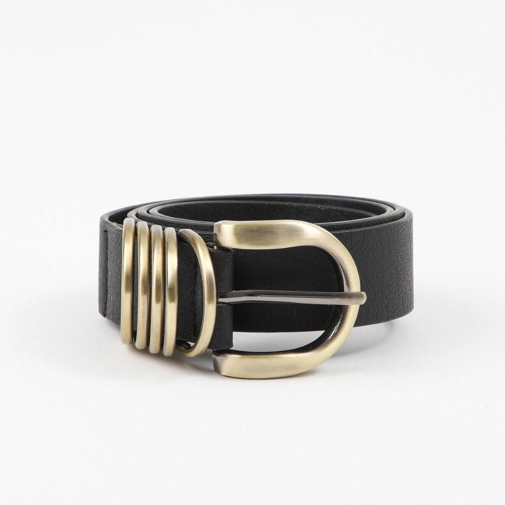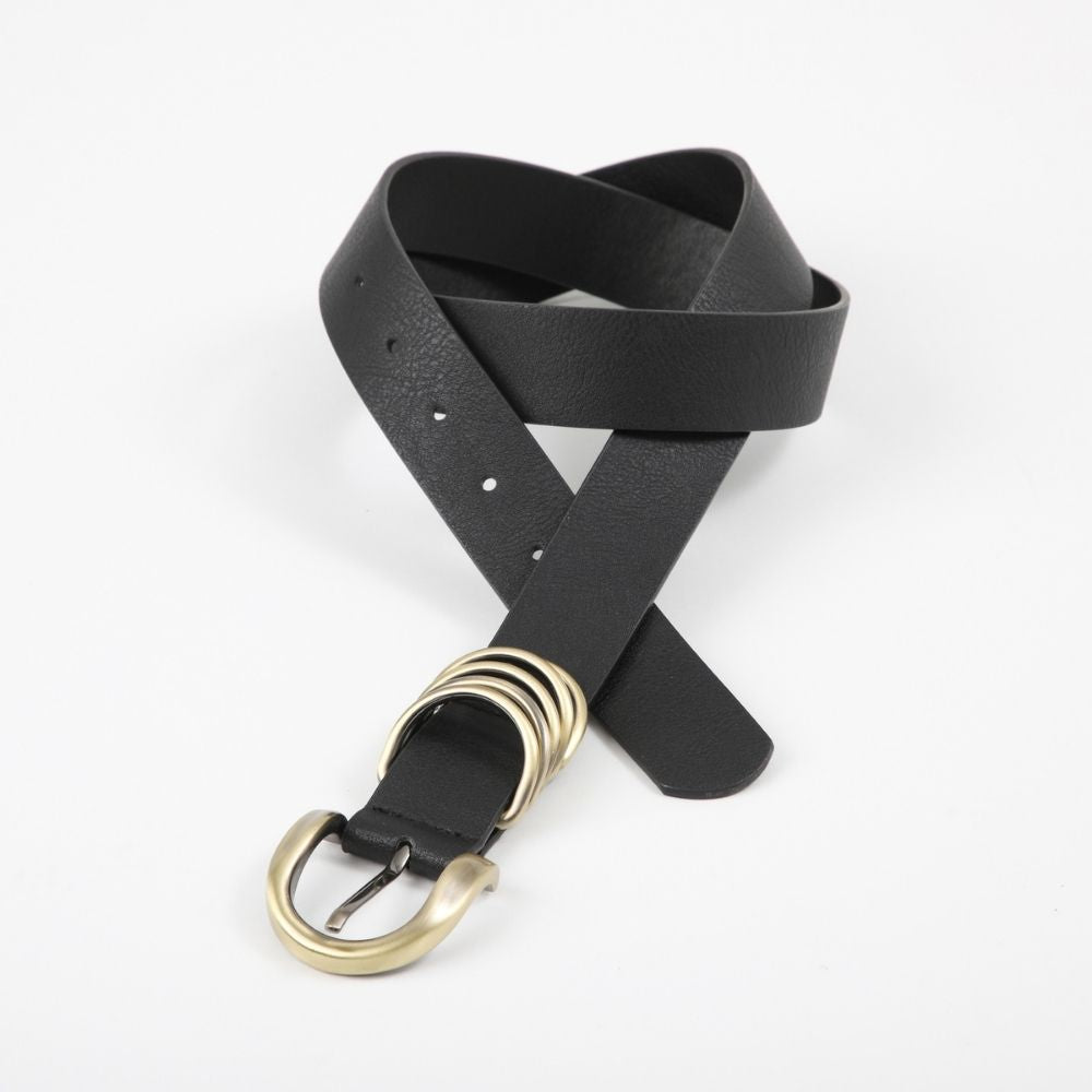 Cinturón Ecocuero Negro Opaco De 110 Cm De Largo, En La Hebilla Lleva 5 Argollas Para Cruzar La Punta Del Cinturón. Las Argollas Y Hebilla Van En Metal Dorado.