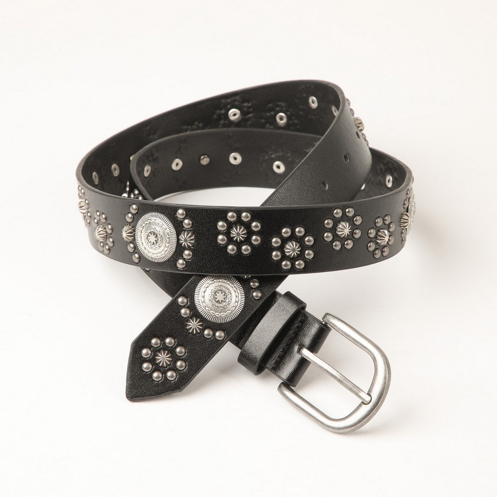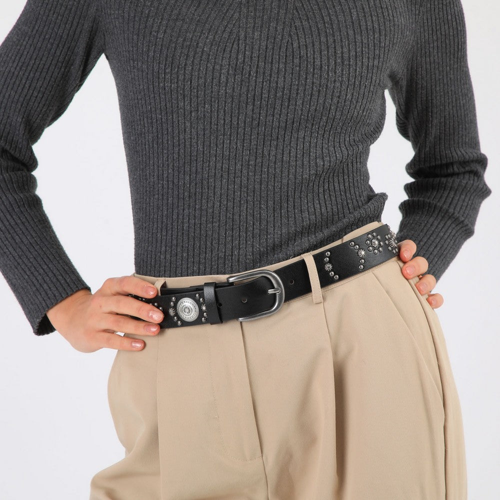 Cinturón negro con tachas metálicas y aplicaciones circulares en tono plateado envejecido. Presenta hebilla metálica clásica y terminación recta. Un accesorio de estilo marcado, ideal para complementar distintos looks.