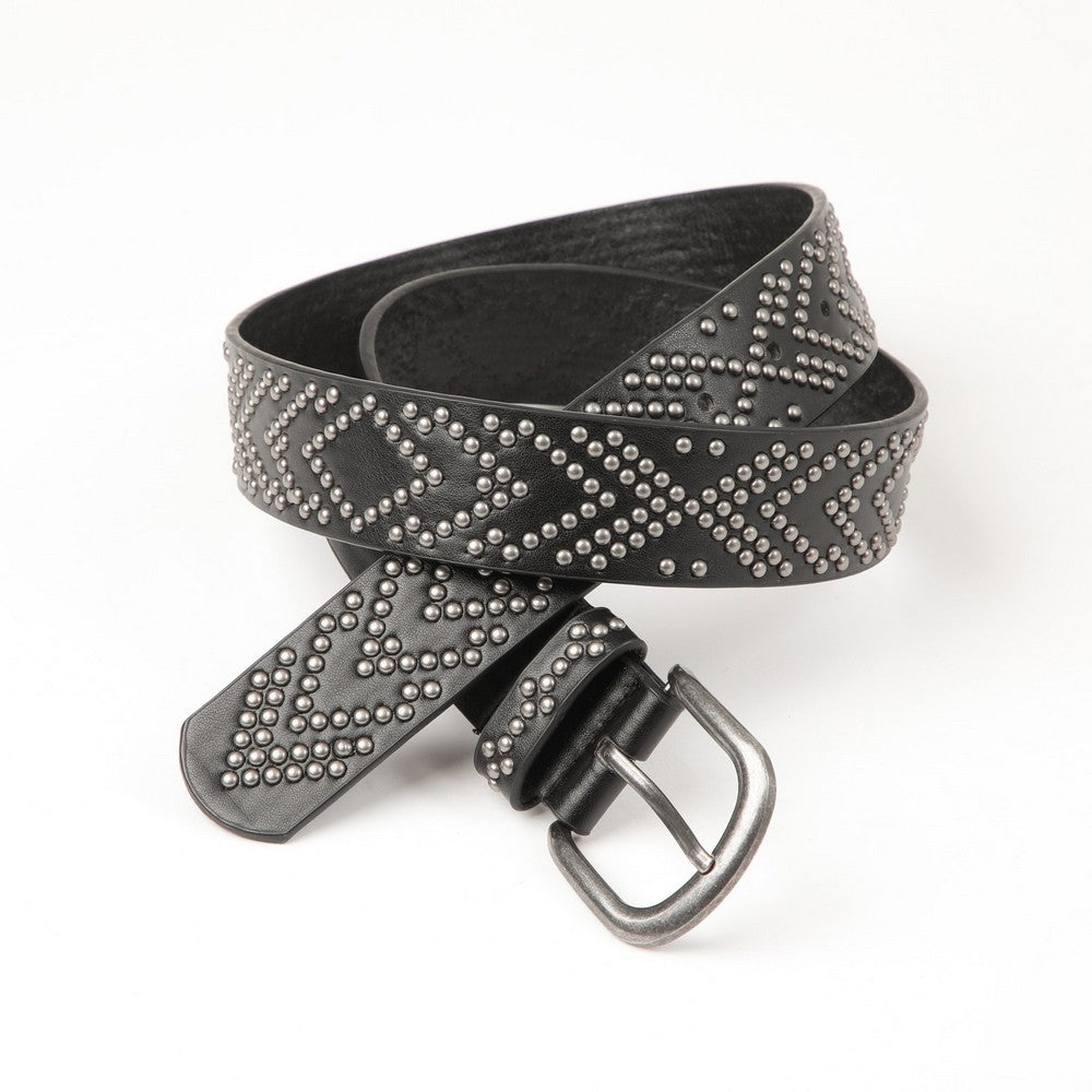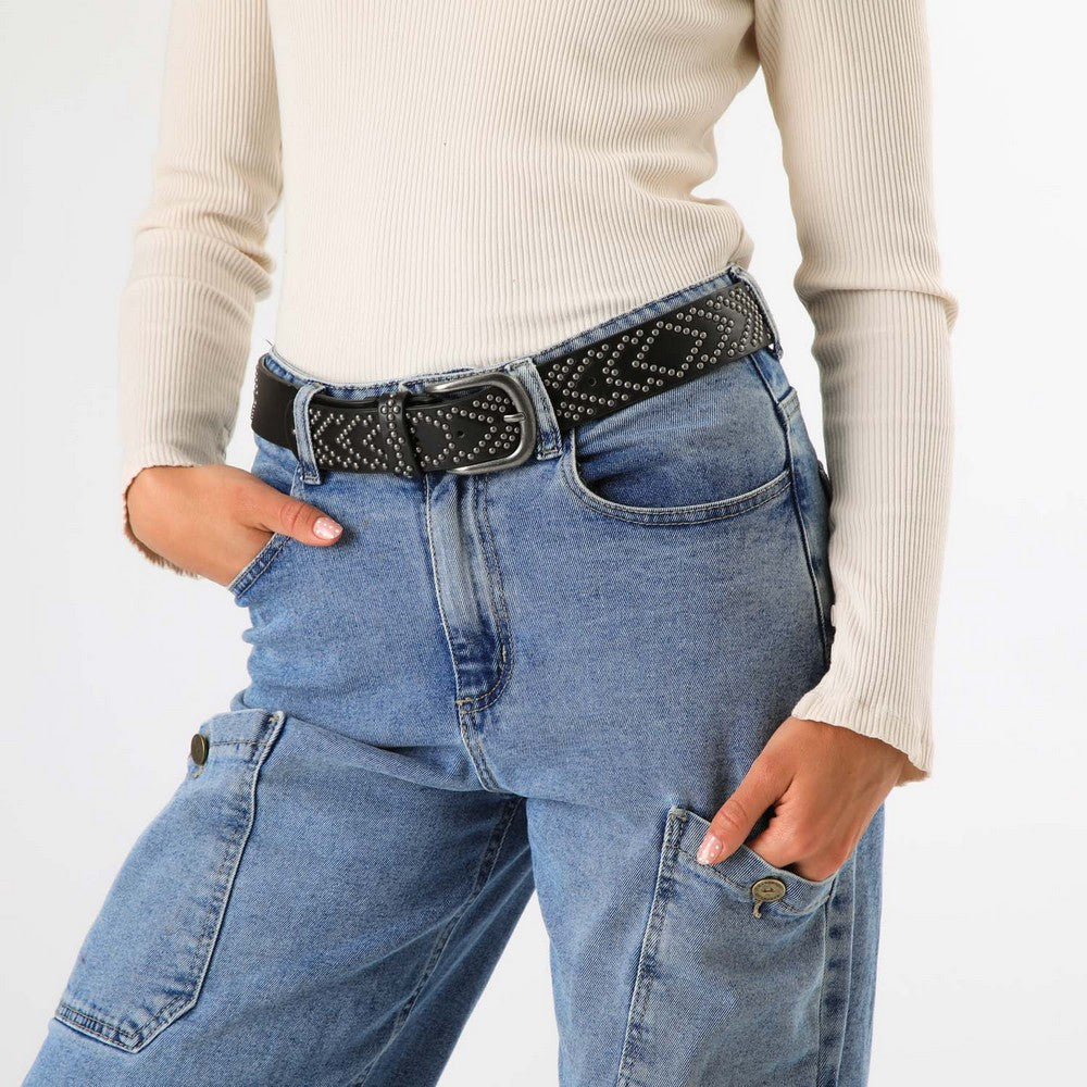 Cinturón de color negro con diseño de tachas metálicas distribuidas a lo largo de la pieza. Incluye hebilla metálica en tono plateado y pasador con tachas a juego. Un accesorio práctico para el día a día.
