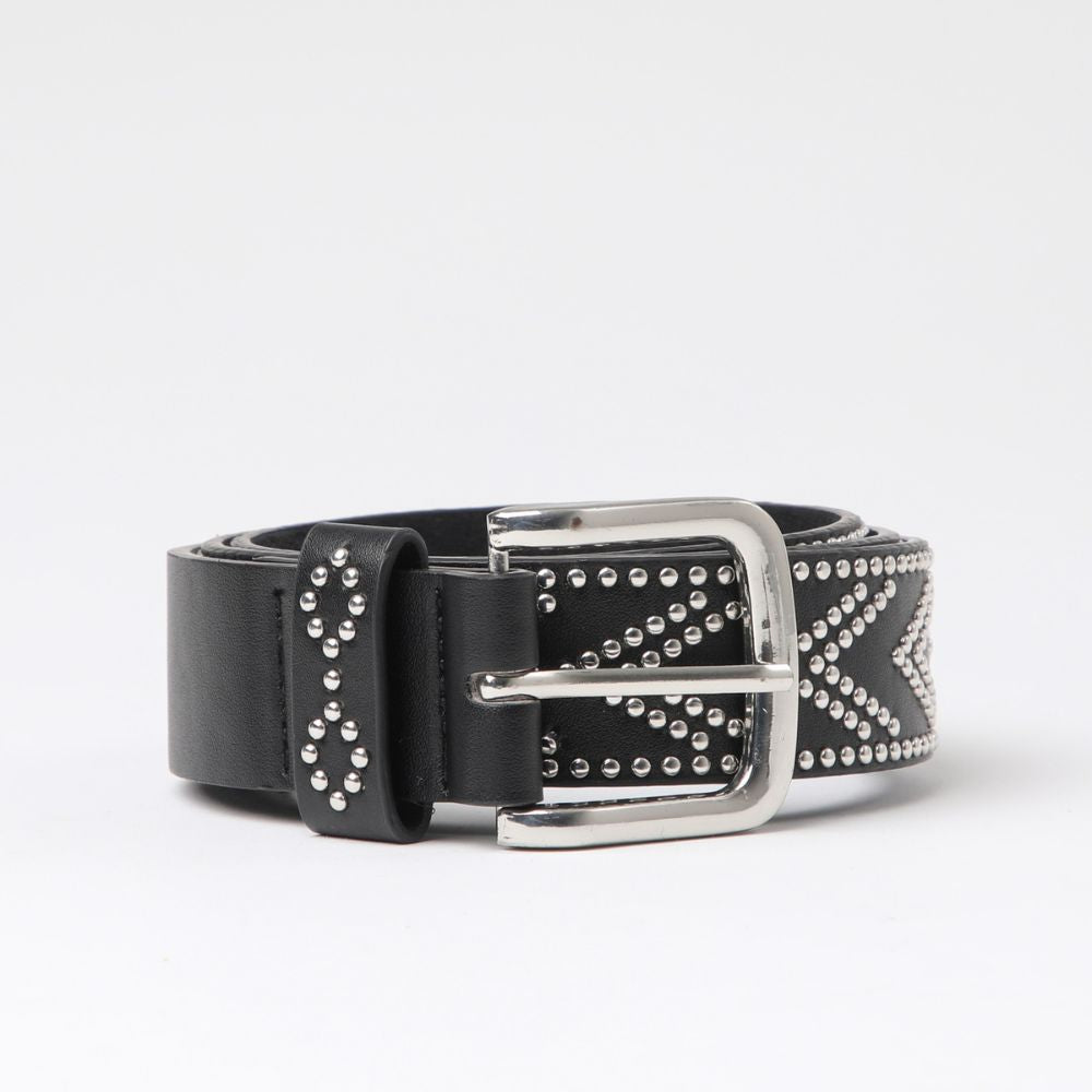 Cinturón negro liso ecocuero con hebilla mediana. Este cinturón de ecocuero negro de 110 cm y cuenta con 5 ojales.. En el cinutrón tiene tachas metálicas pequeñas en un patrón triangular continuo. Tiene una hebilla metálica rectangular mediana color plateado y un pasador con tachas plateadas en el.