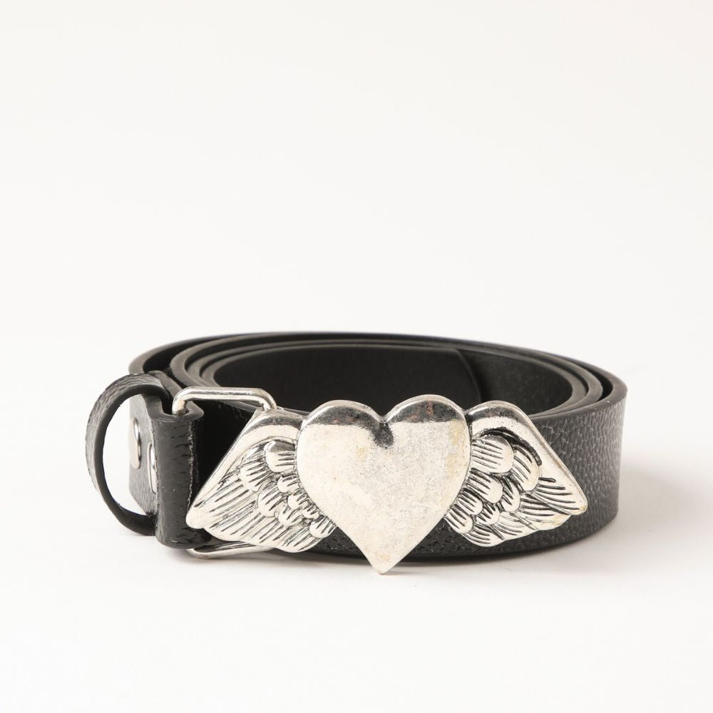 Cinturón ecocuero negro tipo acharolado de 110 cm de largo. Tiene una hebilla en metal plateado con forma de corazón alado.