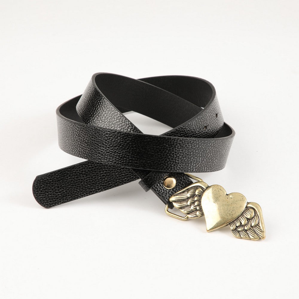Cinturón en color negro, con hebilla decorativa en tono dorado con forma de corazón y alas. Presenta detalles metálicos a juego y perforaciones regulables. Un accesorio llamativo y fácil de combinar, ideal para complementar distintos looks.