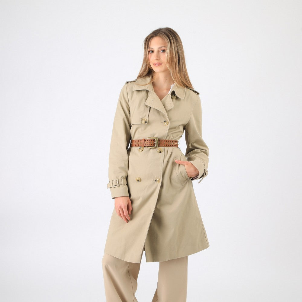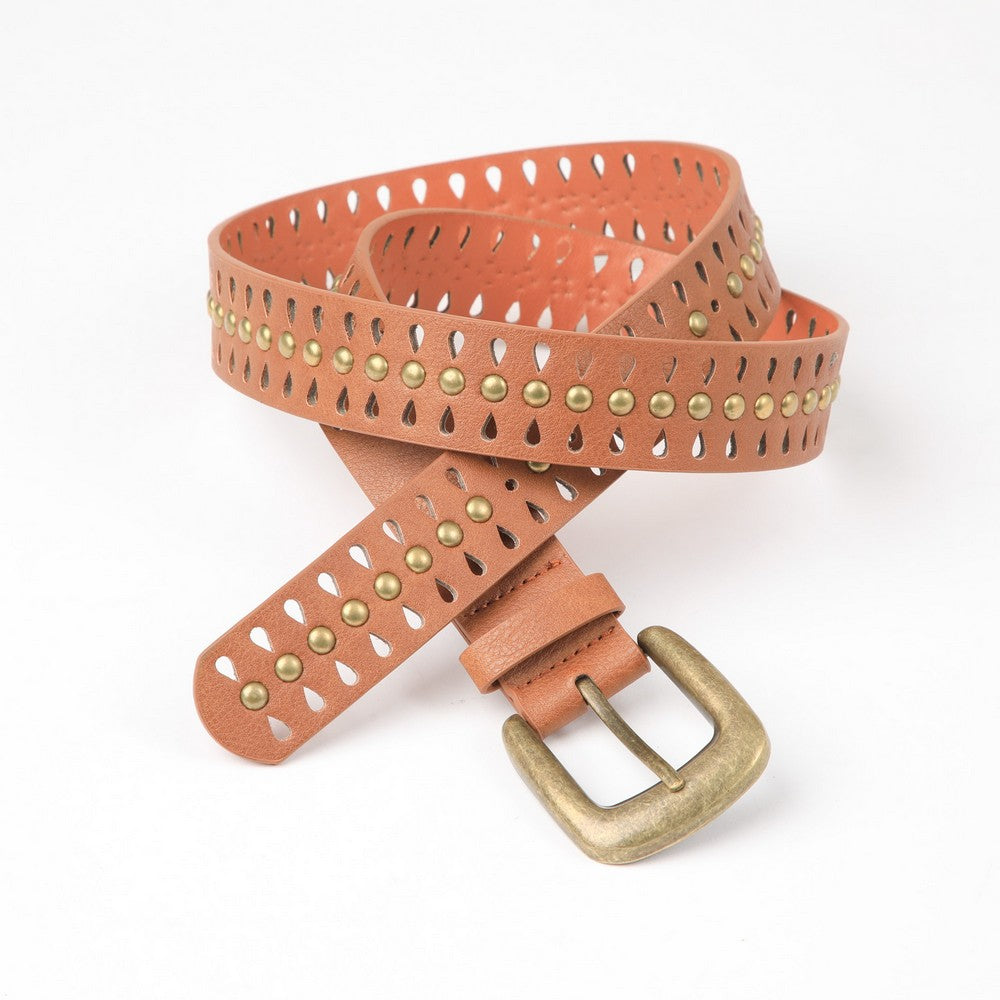 Cinturón de color café, con tachas metálicas en tono dorado envejecido y calados en forma de gota a lo largo de la tira. Presenta hebilla metálica envejecida y pasador a juego. Un accesorio ideal para complementar looks casuales.