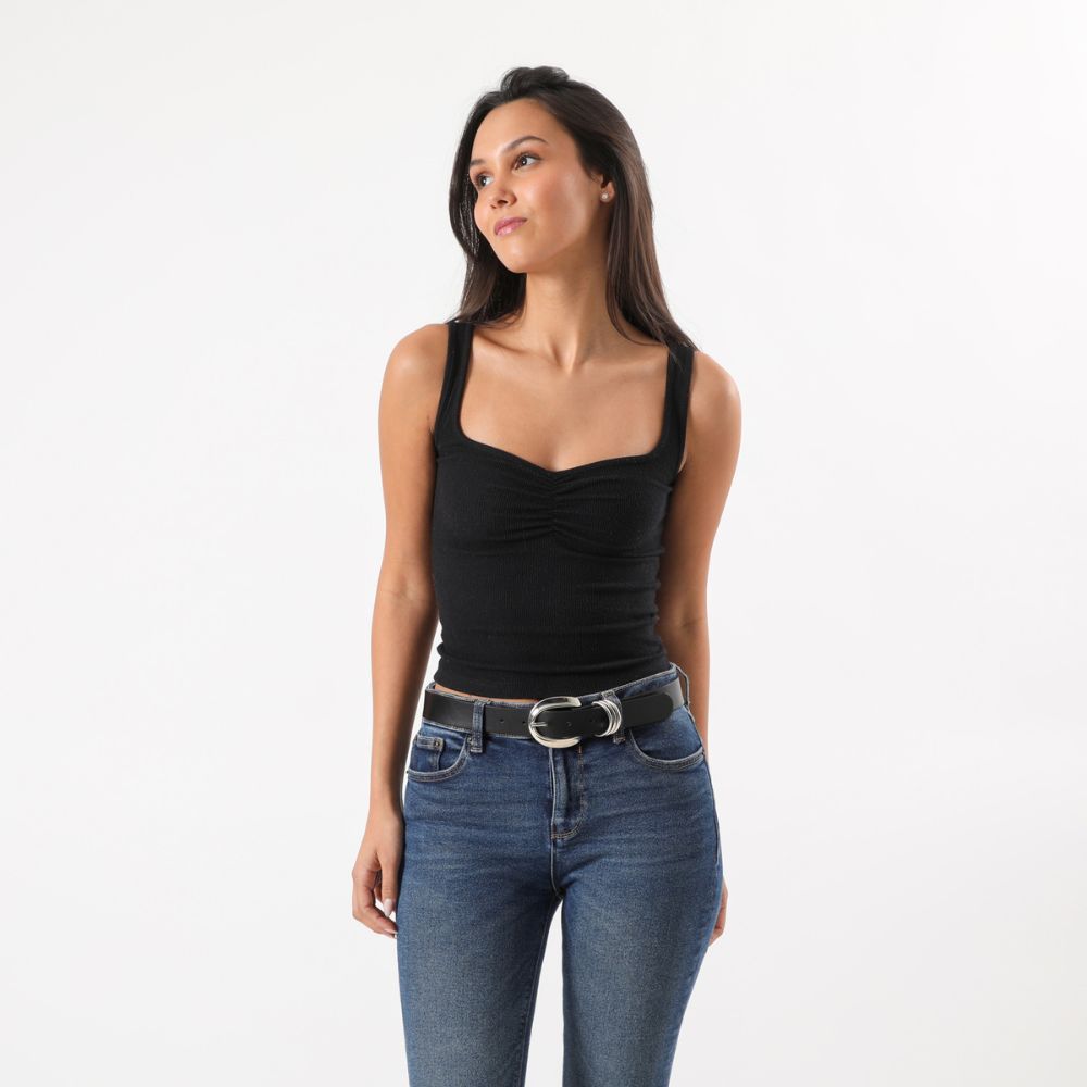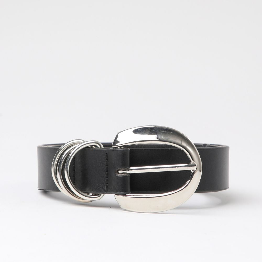 Cinturon negro de ecocuero liso con hebilla plateada gruesa y tres pasadores metálicos plateados.