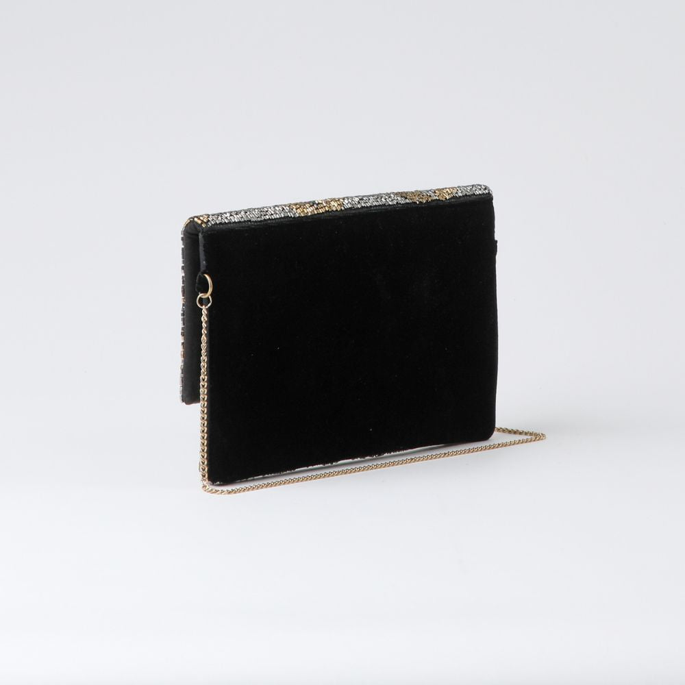 Cartera negra rectangular de tela aterciopelada cubierta por una solapa tipo sobre con iman. Cuenta con 1 bolsillo interior abierto y una cadena plateada para llevarla al hombro o cruzada. El frente está cubierto por grupos de mostacillas doradas y plateadas a modo de patrón geométrico.