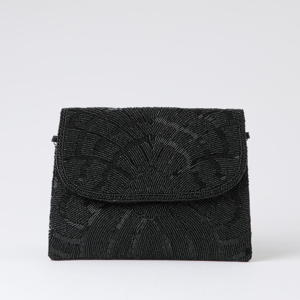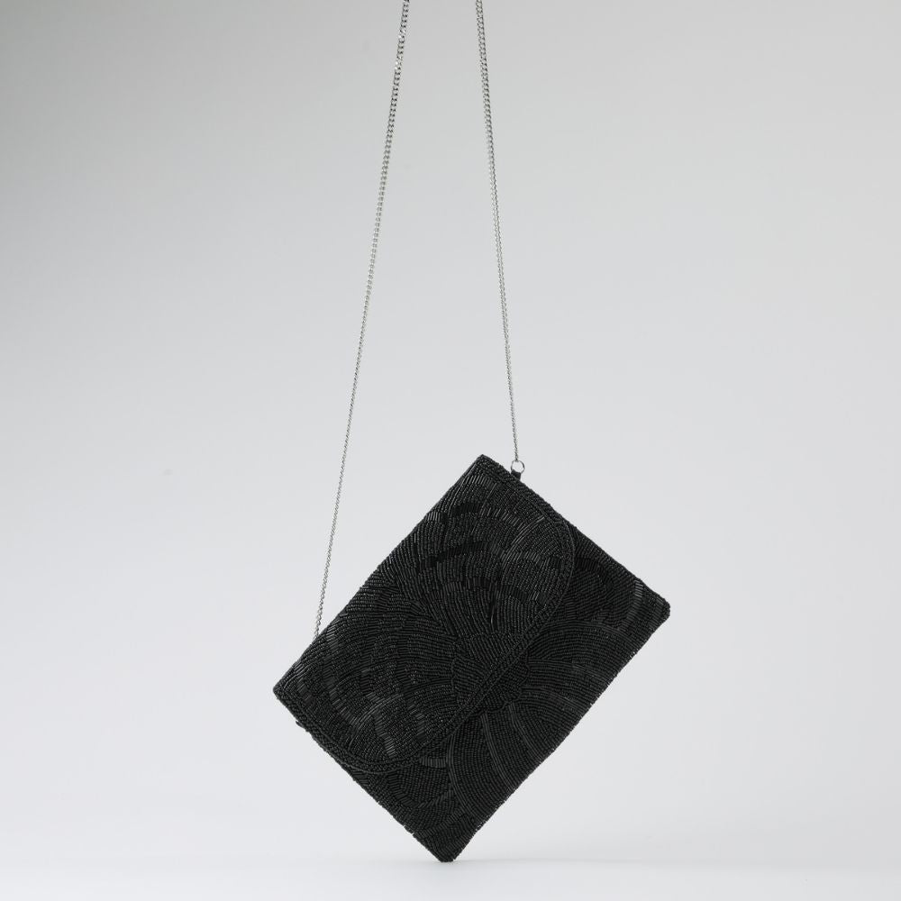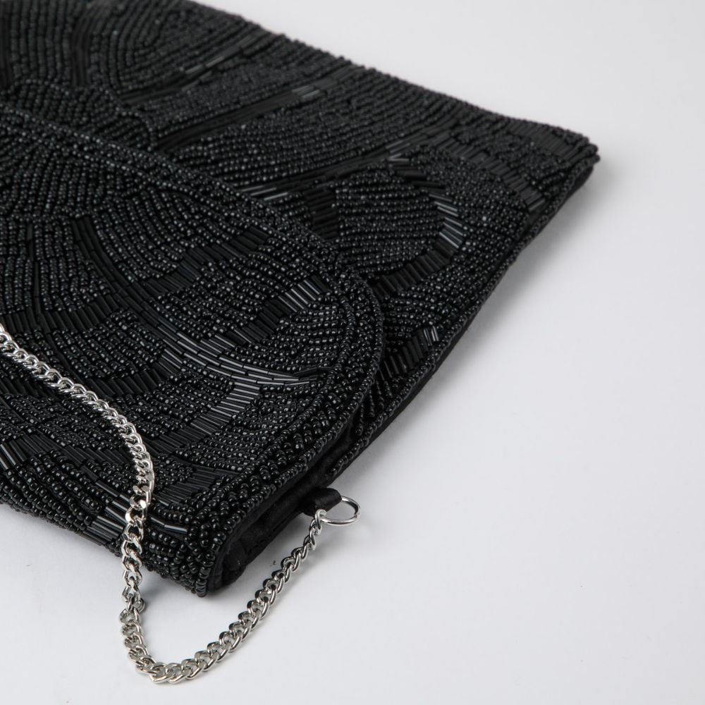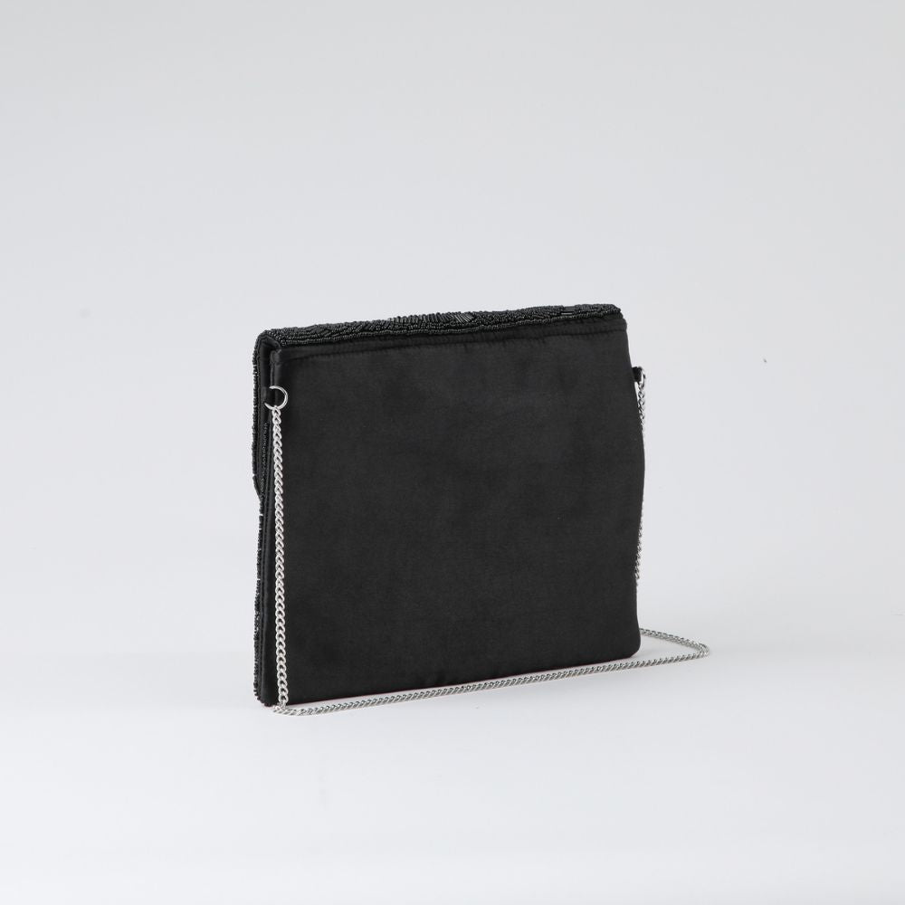 Cartera negra rectangular de tela satinada, cubierta por una solapa tipo sobre, que se cierra con iman y lleva una correa de cadena plateada para llevarla al hombro o cruzada. Todo el frente está cubierto por grupos de mostacillas negras largas y otros de redondas que conforman un patrón tipo floral abstracto. En su interior también cuenta con 1 bolsillo organizador abierto.