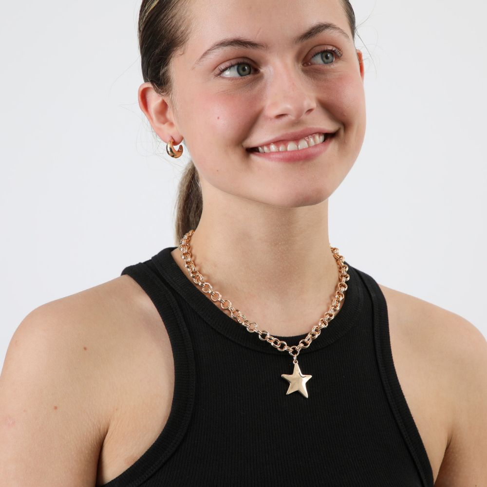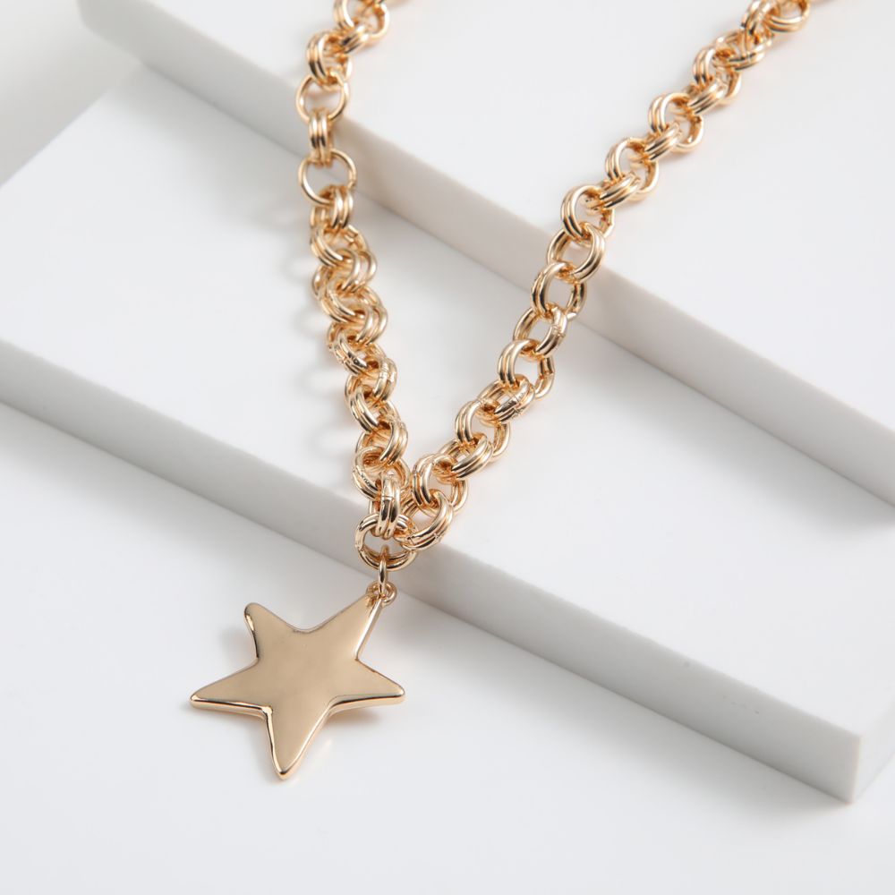 Collar tipo choker en metal dorado, consta de una cadena gruesa con dije de estrella grande lisa.