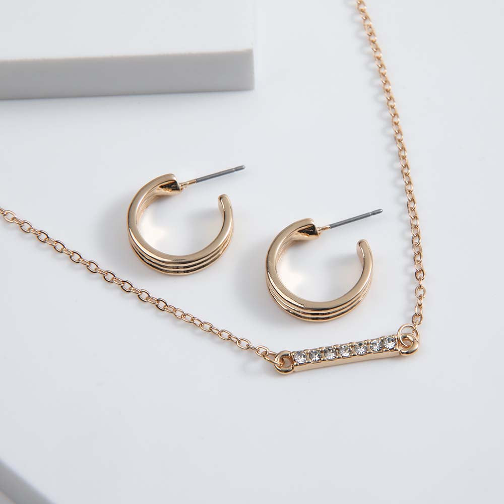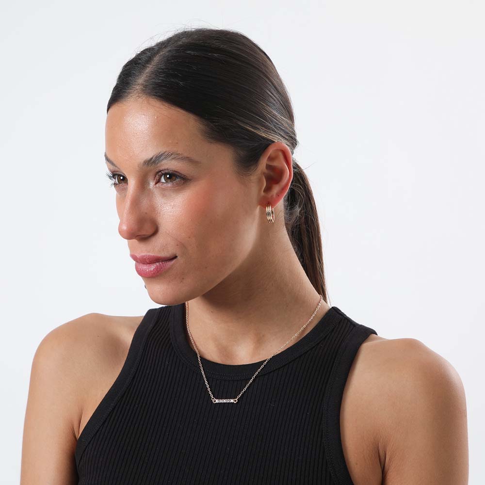 Collar + Aro Humana Peñiscola de color dorado. Este set está compuesto por un par de argollas doradas y un collar de cadena con una placa rectangular con brillos incrustados.