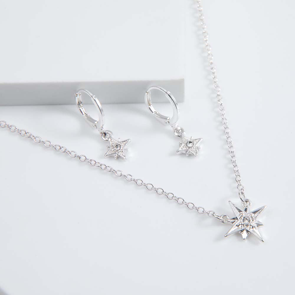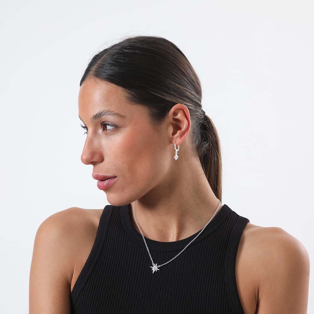 Collar + Aro Humana Rodas de color plateado. Este set esta compuesto por un par de argollas con estrellas colgantes con brillantes y un collar de cadena con una estrella al centro con un brillante incrustado.