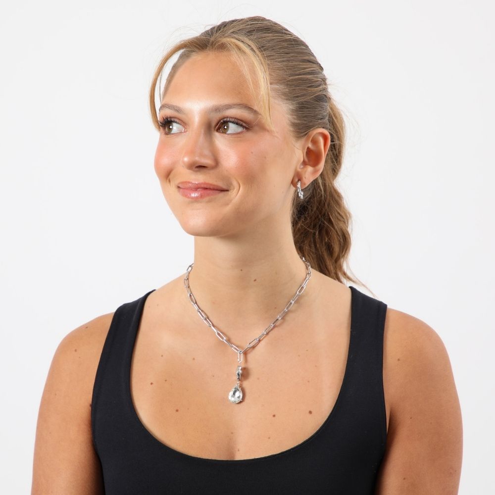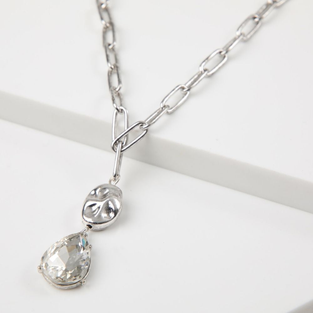 Collar corto de cadena de eslabones grande plateada con dije de pieza martillada y piedra de fantasía
