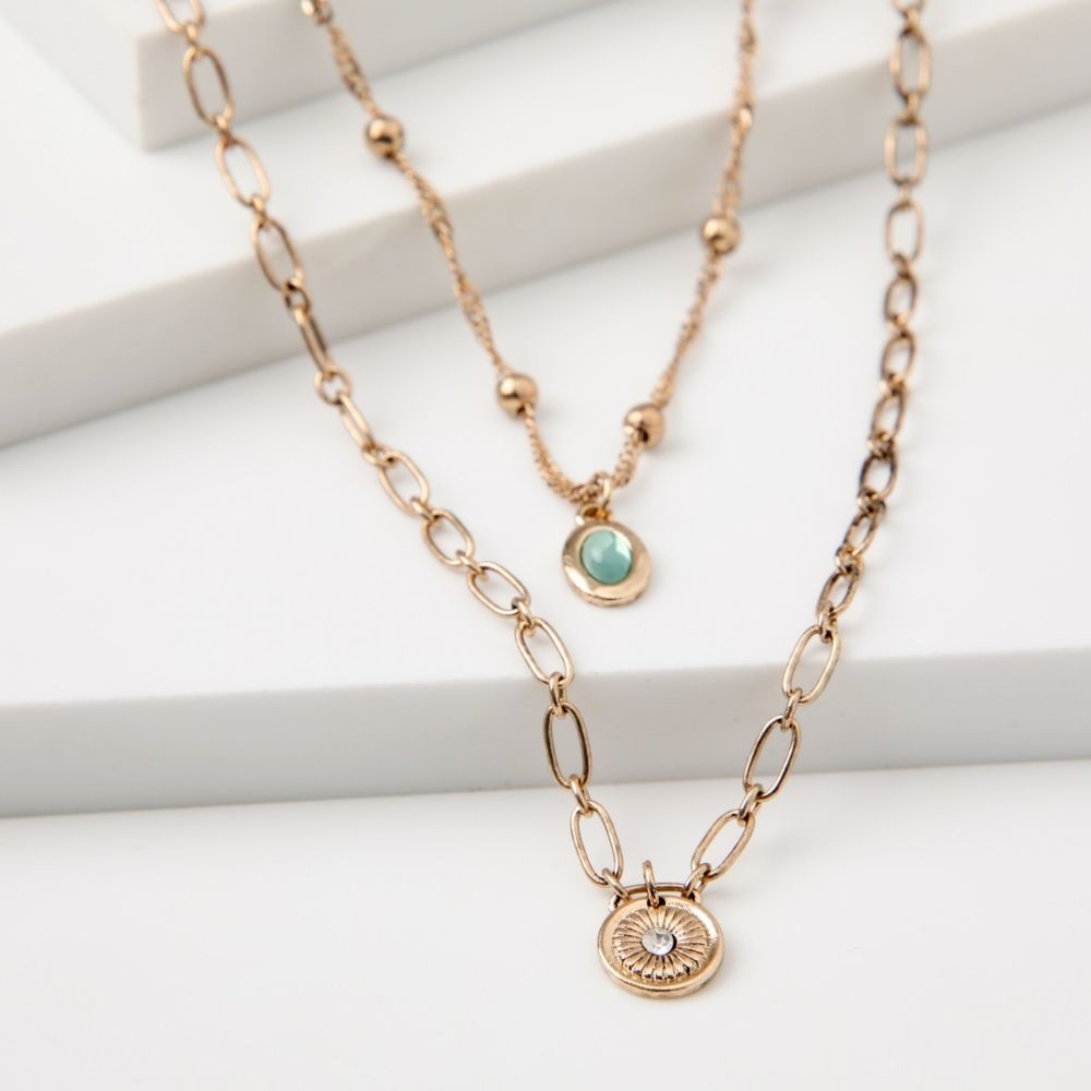 Collar de doble cadena. Una de eslabones medianos y dije circular con brillante de fantasía blanco y otra cadena con esferas metálicas y dije ovalado de piedra de fantasía turquesa.