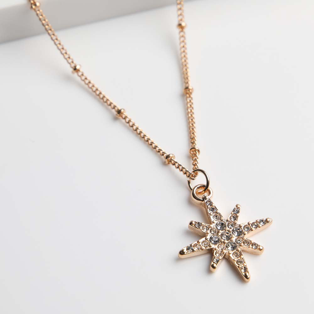 Collar Corto Essential Belén, de cadena fina con pelotitas. La estrella colgante está llena de brillos ideal para lucir el collar con una tenida casual, formal e incluso de fiesta. Tiene cadena ajustable.