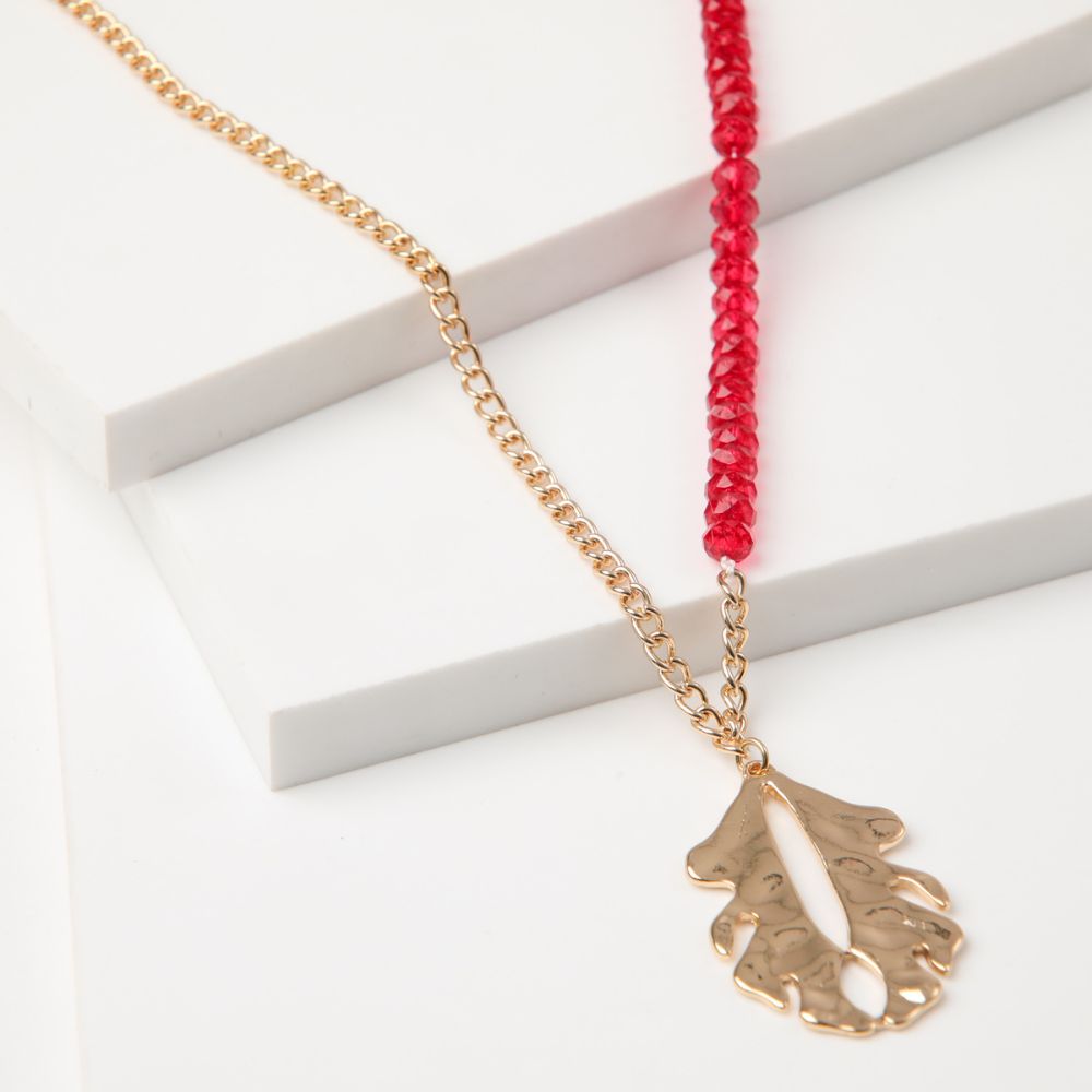 Collar de cadena y mostacillas fucsias a un lado. Lleva un dije mediano de hoja colgando en el centro.