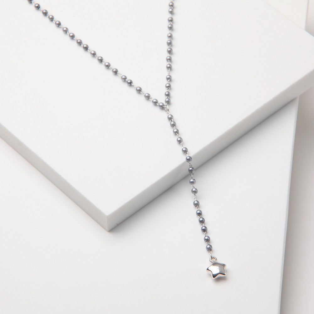 Collar plateado con cuentas metálicas pequeñas a lo largo de toda la cadena y un diseño en “Y” que termina en un pequeño dije de estrella lisa y brillante. Es un accesorio delicado, femenino y muy fácil de combinar para un look moderno y funcional.