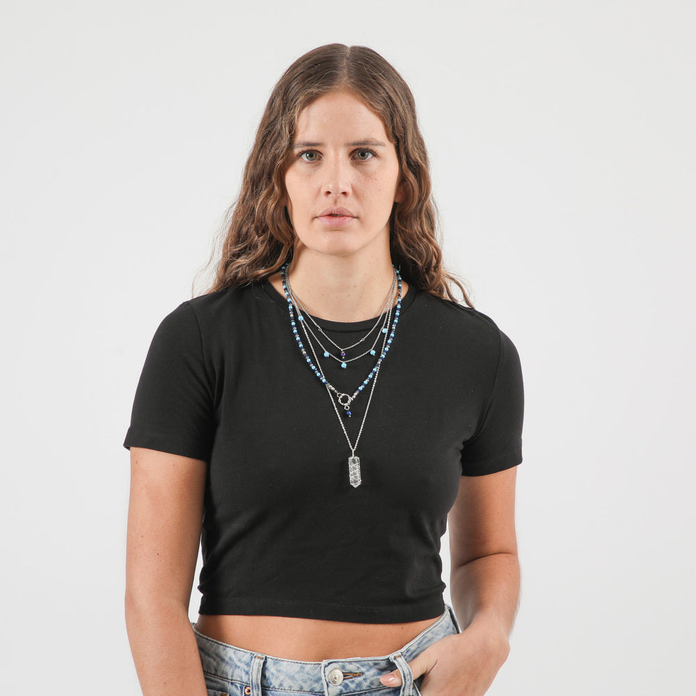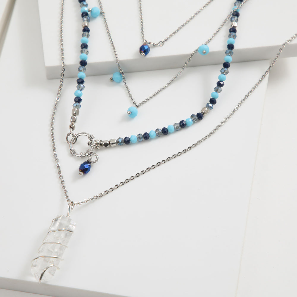 Collar cuádruple de cadena delgada plateada con mostacillas en tonalidades azuladas y dije de piedra real