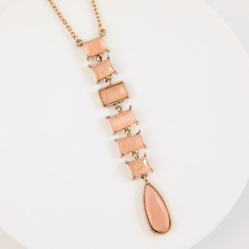 Collar dorado compuesto por una cadena fina con colgante vertical protagonista. El diseño combina cristales de acabado translúcido en tonos rosados, dispuestos en formas geométricas escalonadas y rematados con una pieza tipo gota en la parte inferior. Presenta un estilo femenino y elegante, ideal para realzar looks formales o dar un toque sofisticado a tenidas más simples.