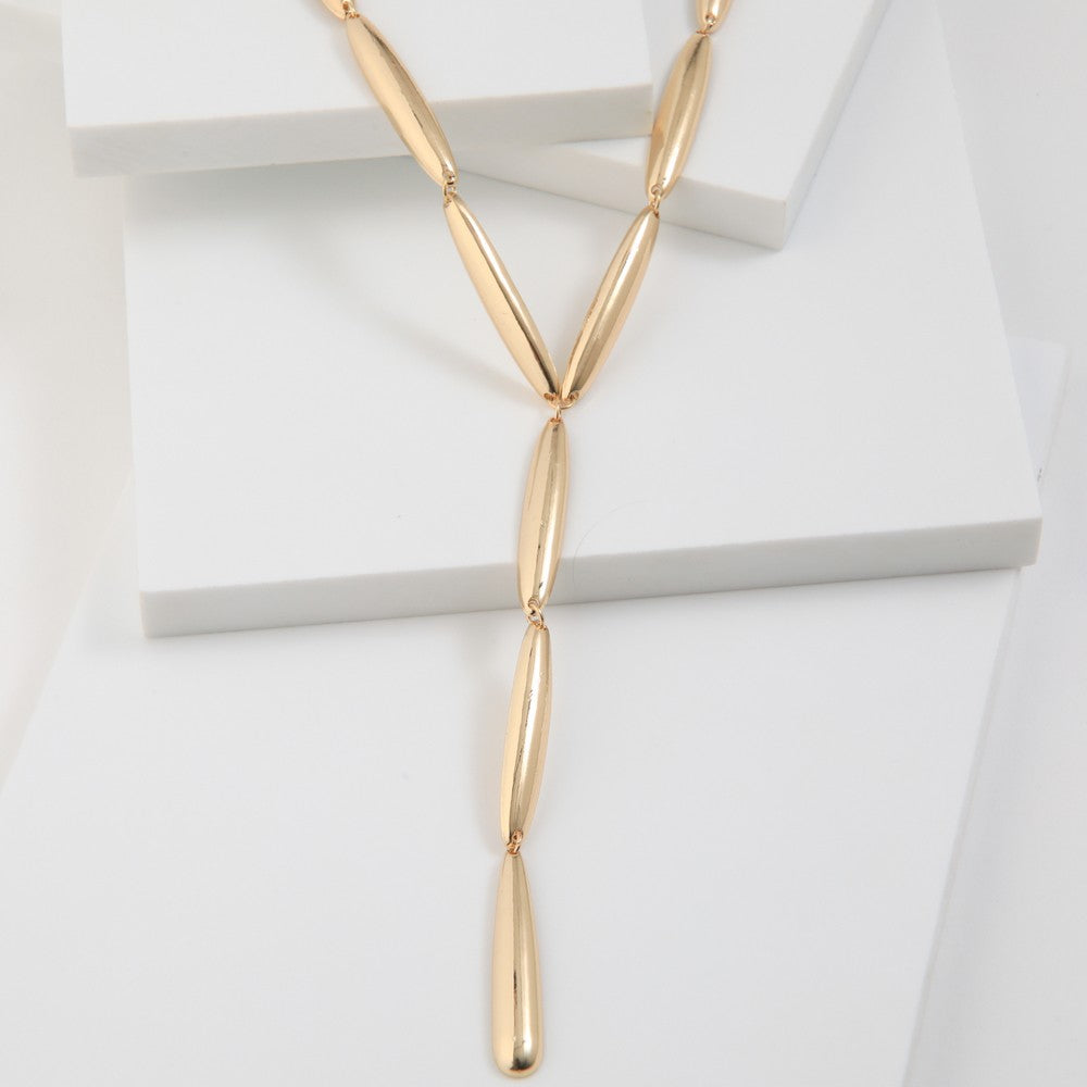 Collar con diseño minimal y estructura geométrica. Está compuesto por eslabones alargados de acabado liso, dispuestos en formato tipo “Y” que estiliza el escote y aporta un look moderno. Su diseño limpio lo convierte en un accesorio versátil, ideal para usar solo o combinado con otros collares. Un collar moderno y funcional, fácil de combinar y perfecto para elevar looks simples.